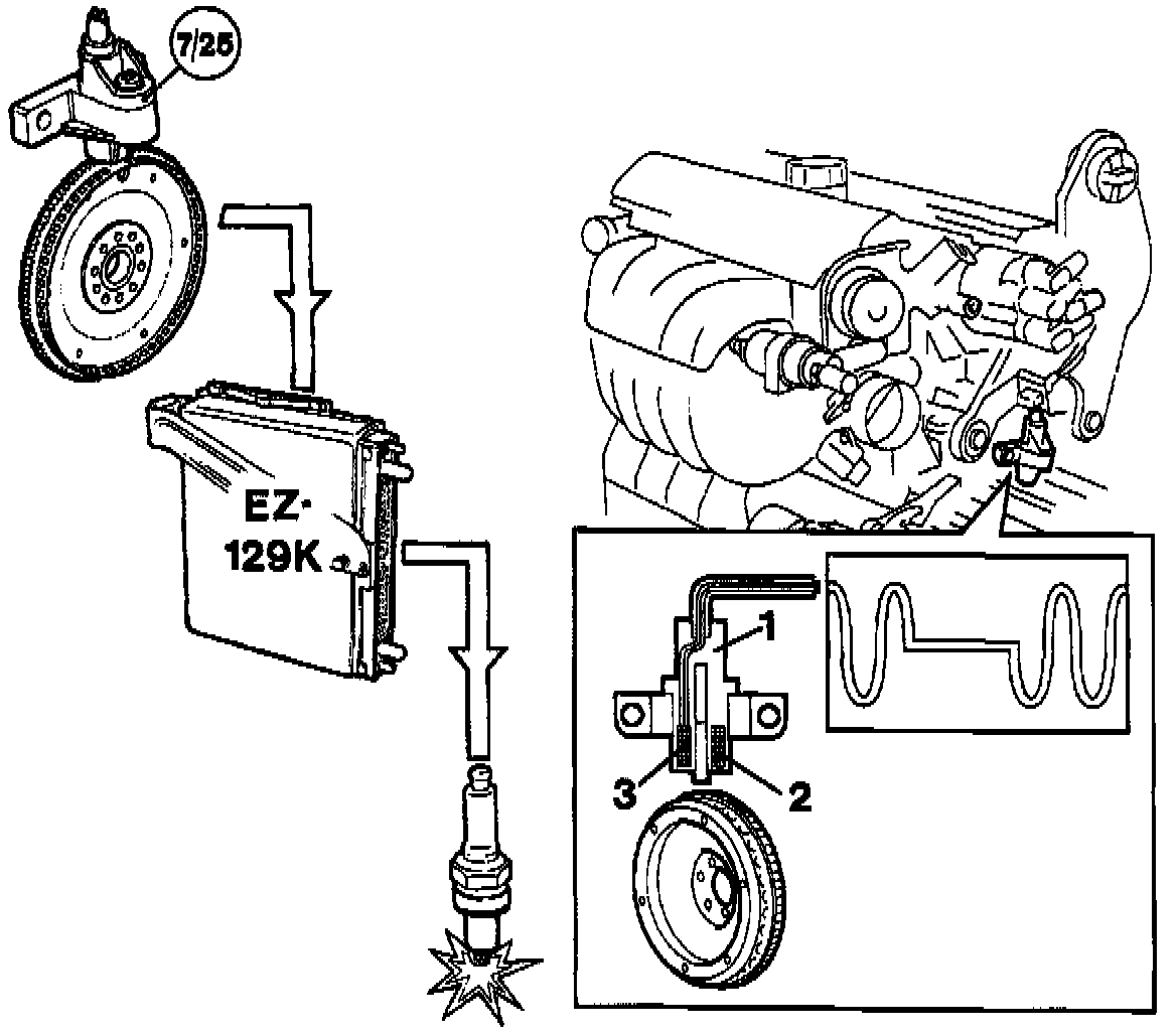 In a manual model, the periphery of the flywheel is provided with 58 holes (in automatics, the carrier plate is provided with 57 holes). The spacing between two of the holes is greater at the point corresponding to 90° before TDC in cylinder No. 1.