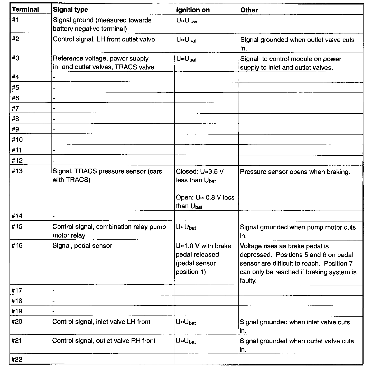 All values shown above are between the terminal shown in column 1 and terminal #1 (signal ground), unless shown otherwise in brackets.