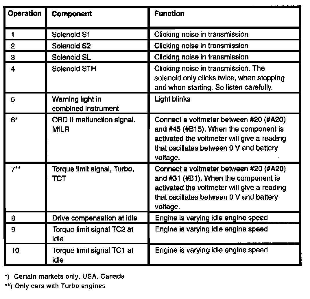 When activating operation 6 and 7, according to the table below, no change/symptom is indicated on the engine, transmission or combined instrument. To check these functions proceed as follows before activating DTM 3: