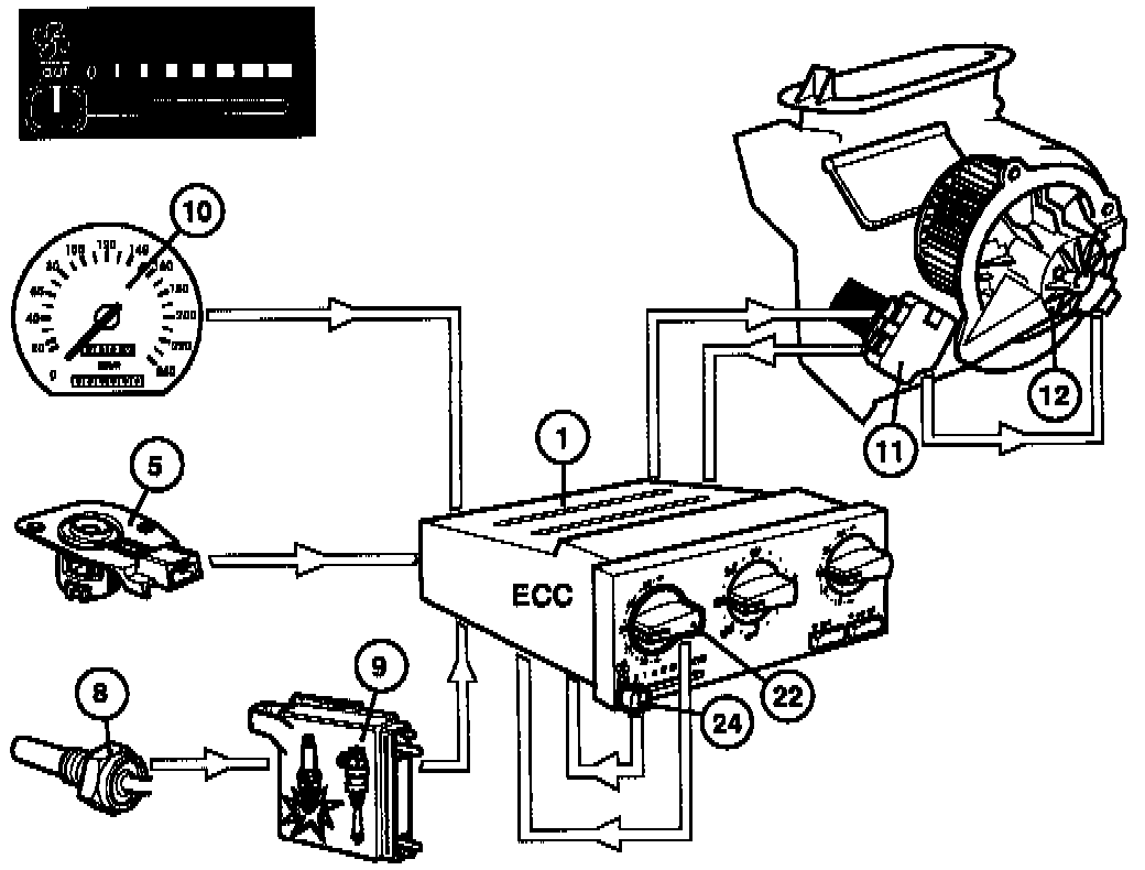 The heater fan (12) speed is controlled steplessly by the power stage (11) in response to signals from the control module (1). If the fan speed control (24) is set to automatic, the speed of the module will be influenced by the following factors: