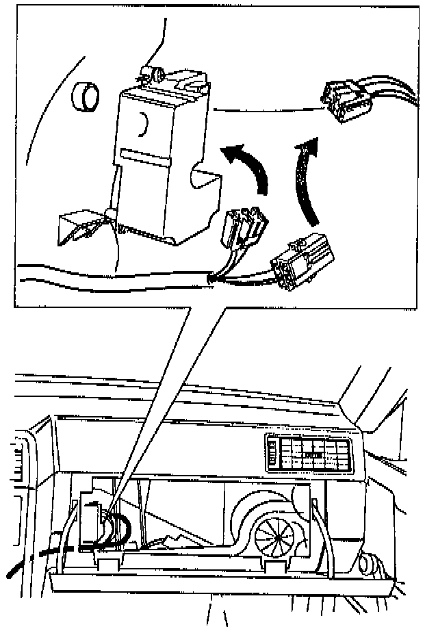 The shutter motor is in back of the glove compartment, as shown in illustration. Connect the connector on the cable harness to the disconnected connector and to the shutter motor.