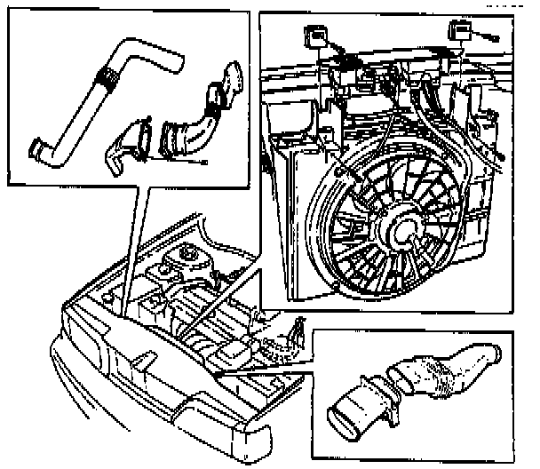 - Move aside shroud, lift relay shelf, open fan connectors and disconnect hoses to EGR controller at intake manifold and EGR valve.