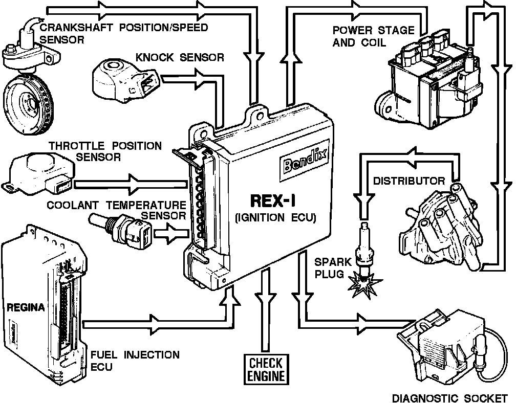 The Rex I ignition is based on the fully electronically controlled Bendix ignition system with knock control. The ECU, located above the steering column, uses electrical input signals from various devices and sensors to calculate the engine load and condition. With this information the ECU adjusts ignition timing to provide optimum performance, economy, and the least emissions output.