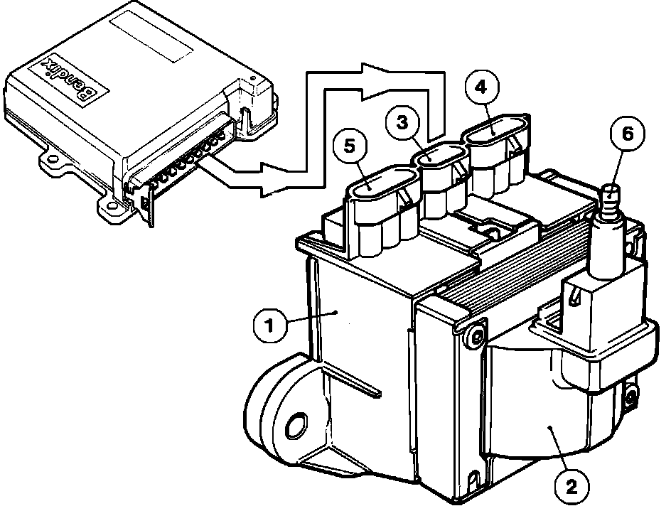 The power stage (1) and ignition coil (2) are one unit, yet assembled for possible individual replacement. The power stage receives the control signal from the ignition ECU at the two-pole center connector (3). The three-pole connector (4) on the right supplies the ignition coil and power stage with battery voltage, grounds the coil and sends a signal to the rev counter in the dashboard. The connector (5) to the left is not used.