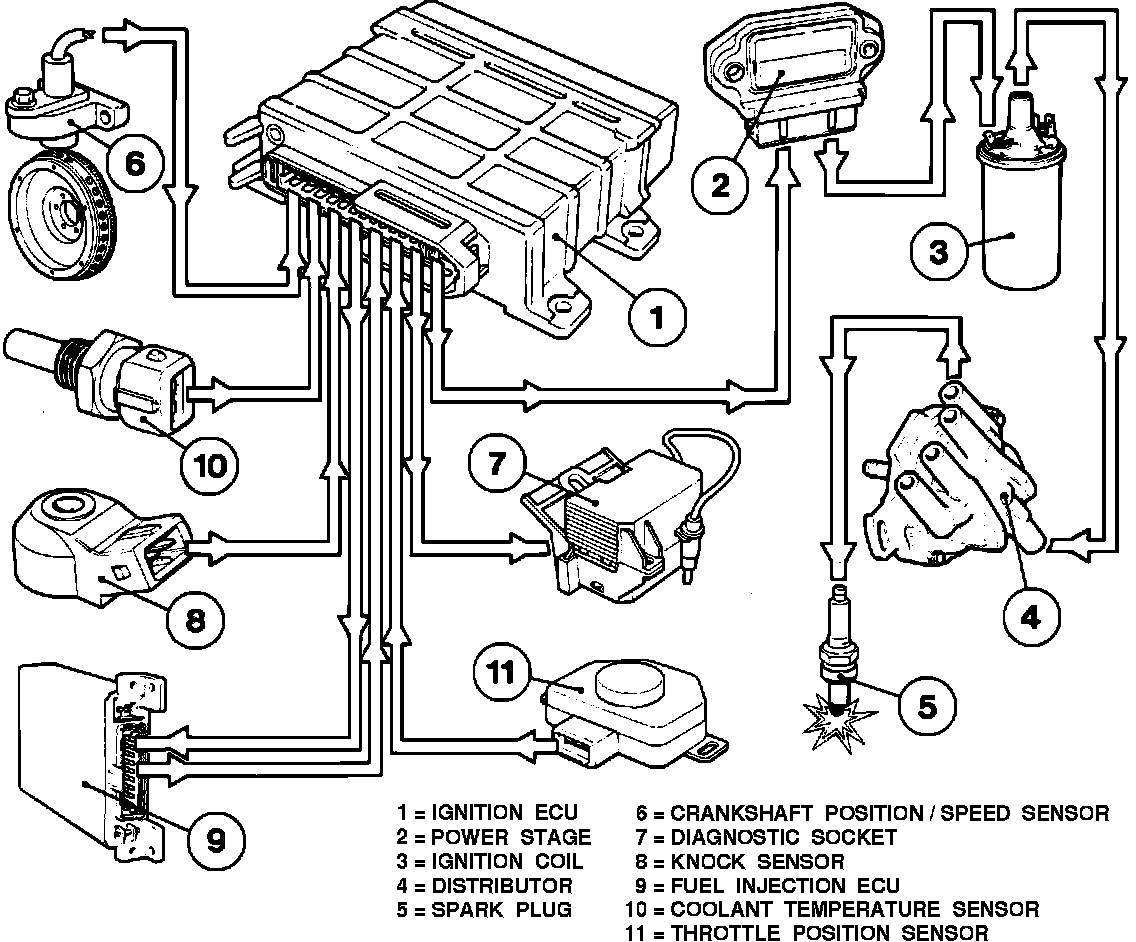 If the self diagnostic circuit ("on board diagnostics") in the ECU detects a fault in the ignition system, it will activate the "CHECK ENGINE" light. By extracting the fault codes from the diagnostic socket, you can determine what component or components need further testing or replacement. The system can store up to three fault codes.