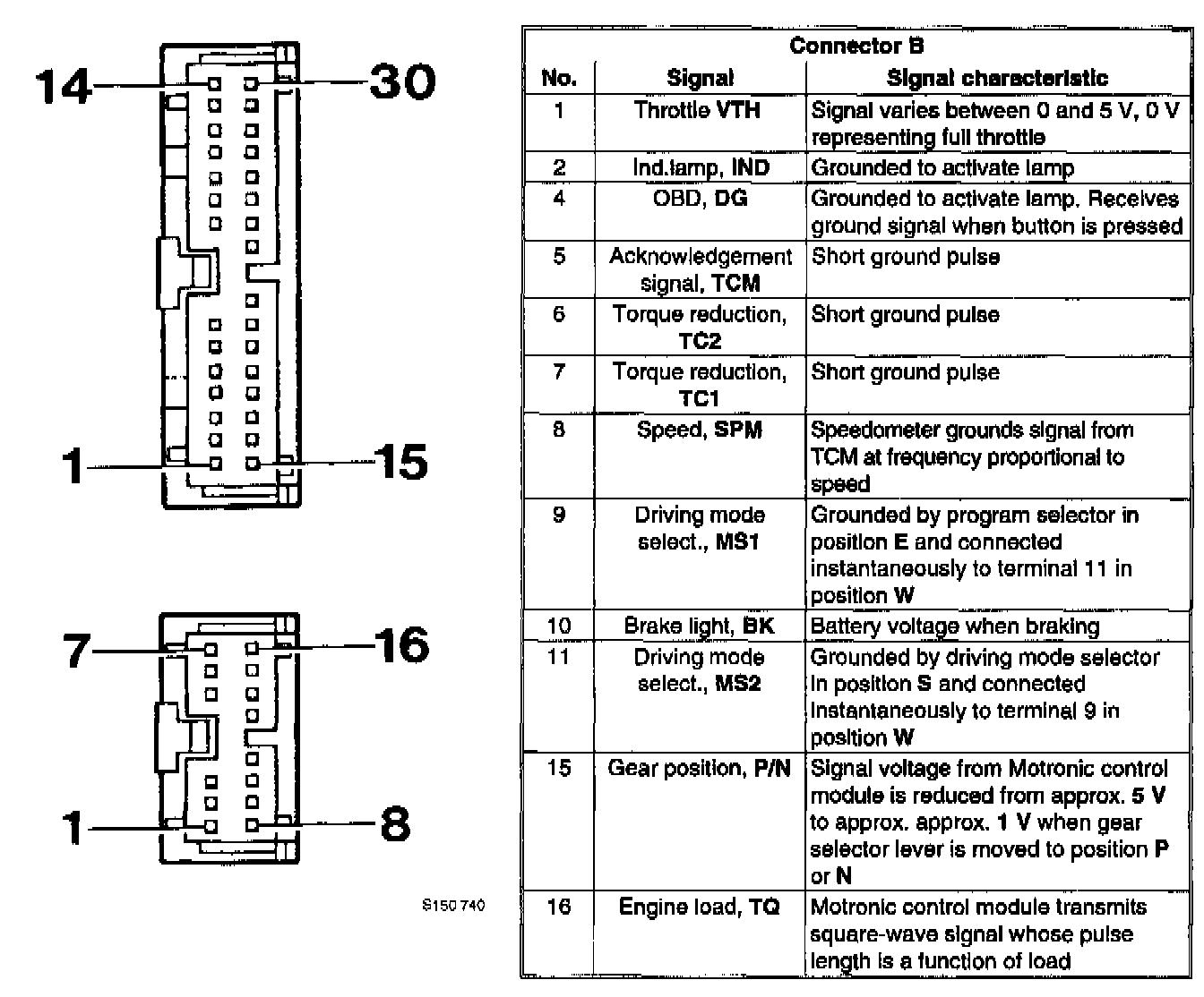 The signals and signal characteristics for each terminal of the TCM 1 6-pin connector are shown in the table. Since terminals 3,12,13 and 14 are not used, they are not included.