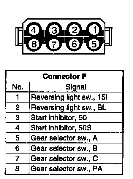 The transmission control system incorporates five unique connectors, two connected to the TCM and two to the transmission itself. Otherwise, the transmission control system wiring is incorporated in the ordinary wiring harnesses, mainly on the left-hand side of the car.