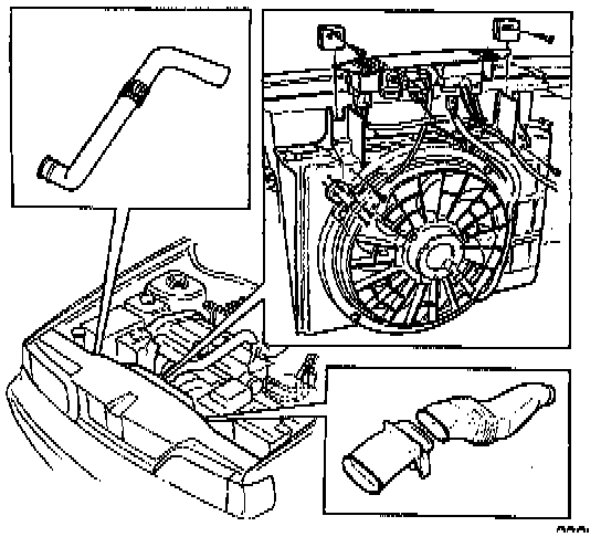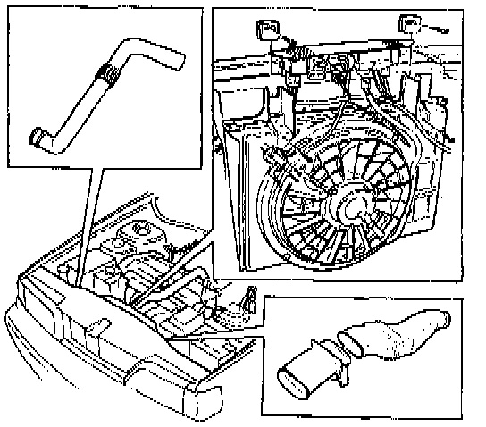 - Move aside fan shroud, lift relay shelf, open Cooling Fan connectors and disconnect hoses to EGR controller at intake manifold and EGR valve.