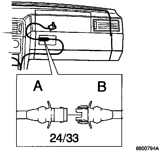 - Disconnect the 2 pin connector 24/33 on the passenger module SRS ignition cable.