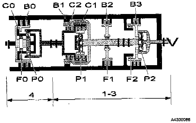 The intermediate shaft is driven by the front train ring gear, and can be connected either to the intermediate planetary train (P1) ring gear by means of clutch (C1) or connected to the sun wheel shaft by clutch (C2). In addition, the sun wheel shaft can be braked by means of band brake (B1).