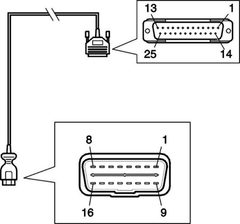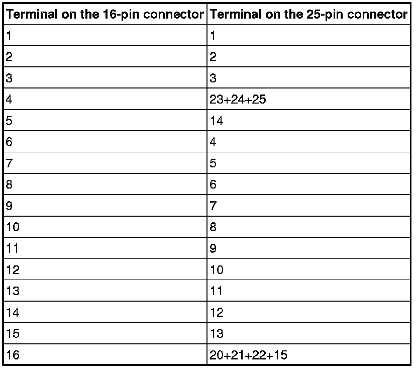 Connect an ohmmeter between the 16-pin and 25-pin connectors according to the table below: