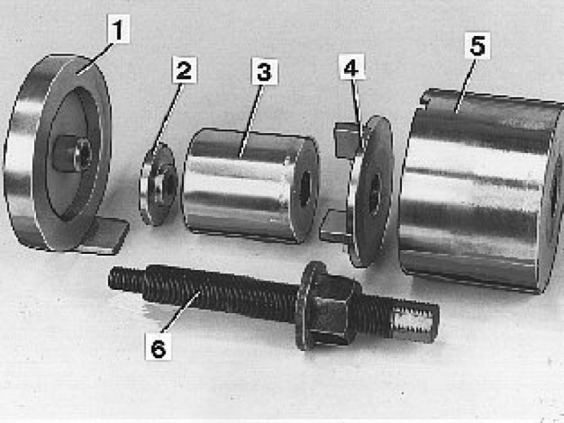 Counterhold (1), Threaded plate (2), Cutting sleeve (3), Drift (4), Spacer sleeve (5), Screw and nut (6).