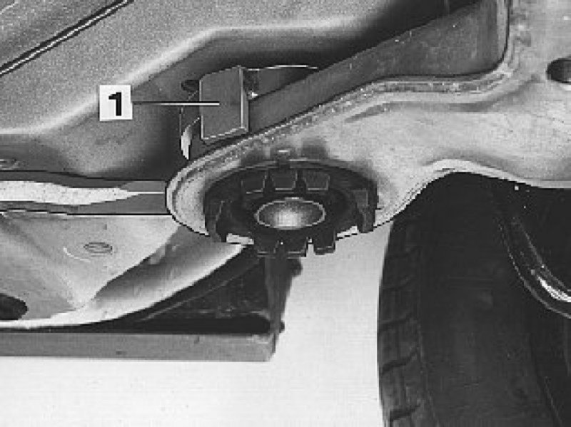 Note! There is a locating pin for the bushing in the bodywork on the left side. When replacing the bushing a jimmy bar must be used to install a the counterhold (1) on the upper side of the sub-frame. See illustration. Use a wood or similar shim between the bodywork and jimmy bar.