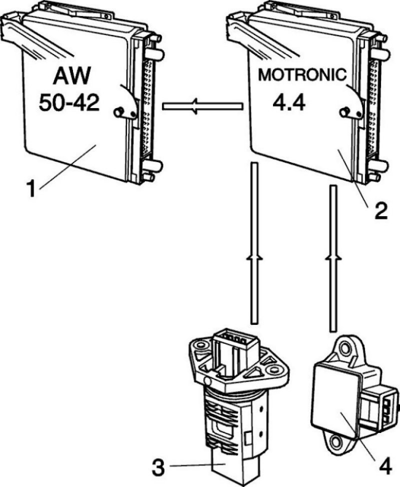 The transmission control module (1) receives the following information from the engine control module (ECM) (2):