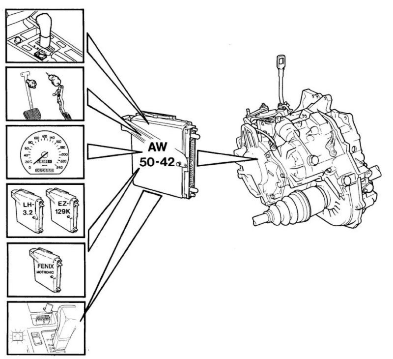 The AW 50-42 is an electronically-controlled four-speed automatic transmission with torque converter lock-up of the three highest gears. Because the transmission is controlled by an electronic control module gear-shifting can be controlled to allow the correct gear to be selected for driving conditions, engine load, driver's wishes, speed, etc. This yields good fuel economy combined with top-class performance and increased comfort by ensuring smoother shifts and lower noise levels.