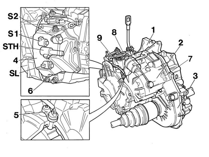 The transmission's mechanical components are enclosed in the torque converter housing (1), the transmission housing (2), with integrated final drive housing (3) and valve housing cover (4). The transmission speed sensor (5) in the transmission housing, the temperature sensor (6), the vehicle speed sensor (VSS) (7) and the gear-shift position sensor (8), which is affected by the gear selector shaft (control shaft) are, like other electric components, connected to a connector (9). The gear-shift position sensor, which informs the control module which gear has been selected, also contains a back-up (reversing) light and a Park/Neutral Position (PNP) switch.