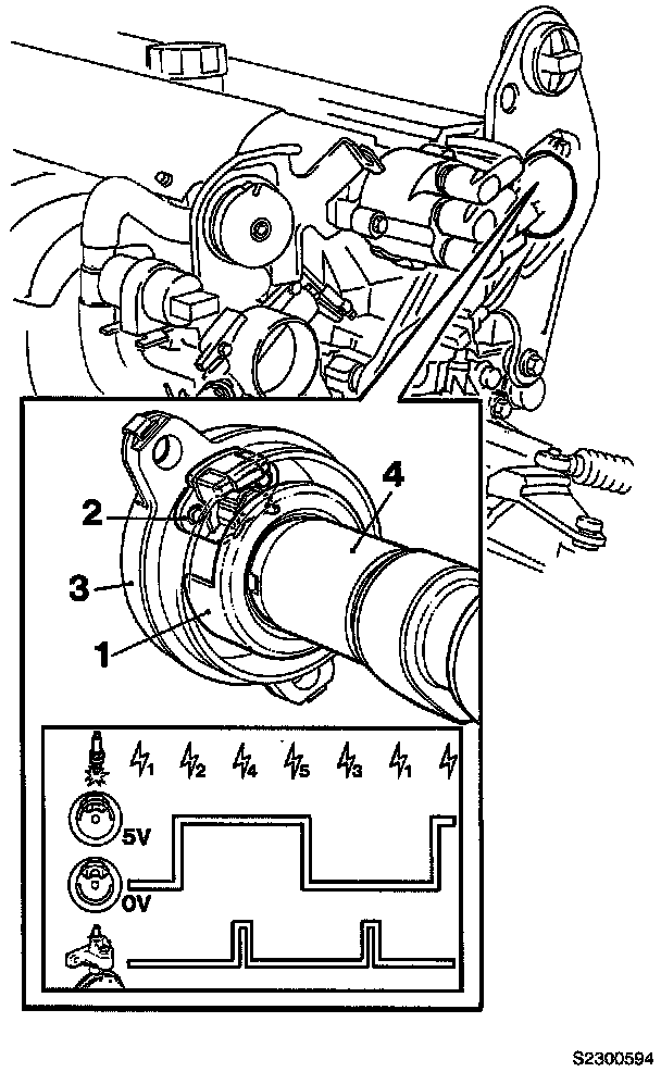 The engine control module (ECM) delivers ignition in cylinders 1 and 3 when the signal is low (0 V) and in cylinders 2, 4 and 5 when the signal is high (12 V).