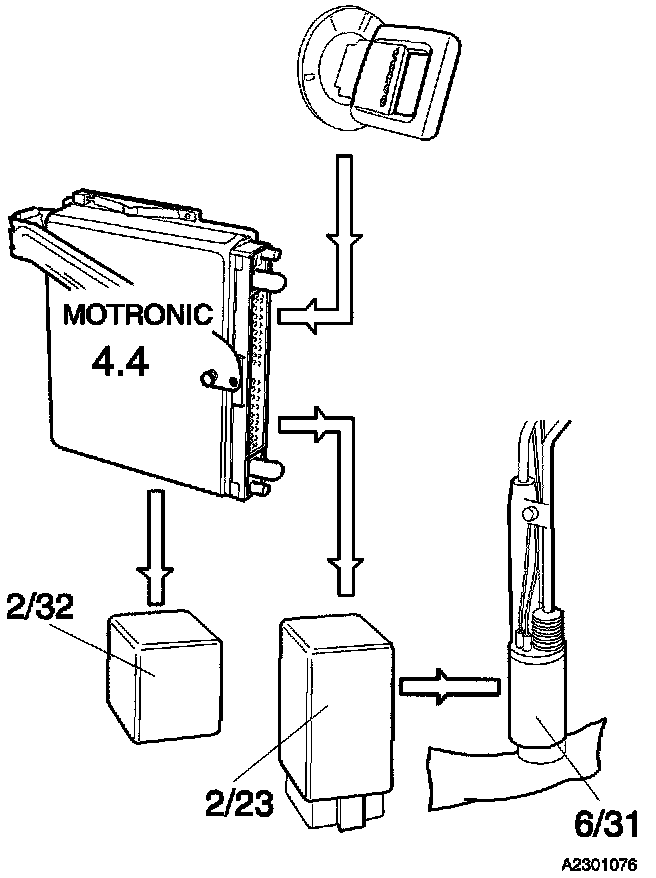 FUEL PUMP CONTROLThe Engine Control Module (ECM) activates the main relay (2/32) when the ignition is switched on. At the same time the Fuel Pump Relay (2/23) is activated for one second to enable the Fuel Pump (FP) (6/31) to build up pressure.