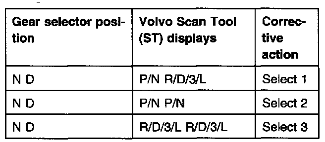 - Move gear selector lever to N and note Volvo Scan Tool (ST) gear position reading.