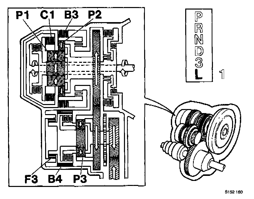 The driving intermediate gear and the planetary gear carrier rotate clockwise as a unit. B3 locks the front planetary train (P2) ring gear so that it cannot rotate in any direction, thus providing an engine brake effect. (In "D" and "3", B3 is not applied, so that no engine braking can be obtained, because of F2.)