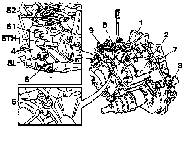 The transmission's mechanical components are enclosed in the torque converter housing (1), the transmission housing (2), with integrated final drive housing (3) and valve housing cover (4). The transmission speed sensor (5) in the transmission housing, the temperature sensor (6), the Vehicle Speed Sensor (VSS) (7) and the gear-shift position sensor (8), which is affected by the gear selector shaft (control shaft) are, like other electric components, connected to a connector (9). The gearshift position sensor, which informs the control module which gear has been selected, also contains a back-up (reversing) light and a Park/Neutral Position (PNP) switch.