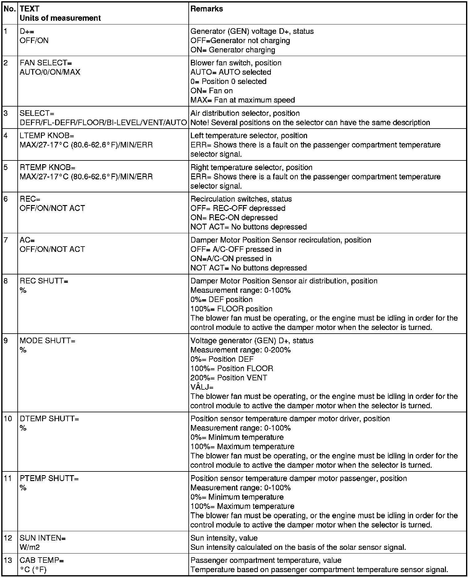 Note! With the air distribution selector in the AUTO position the control module controls some functions, which can be seen by checking certain parameters. For this reason do not use the AUTO position, select another position.