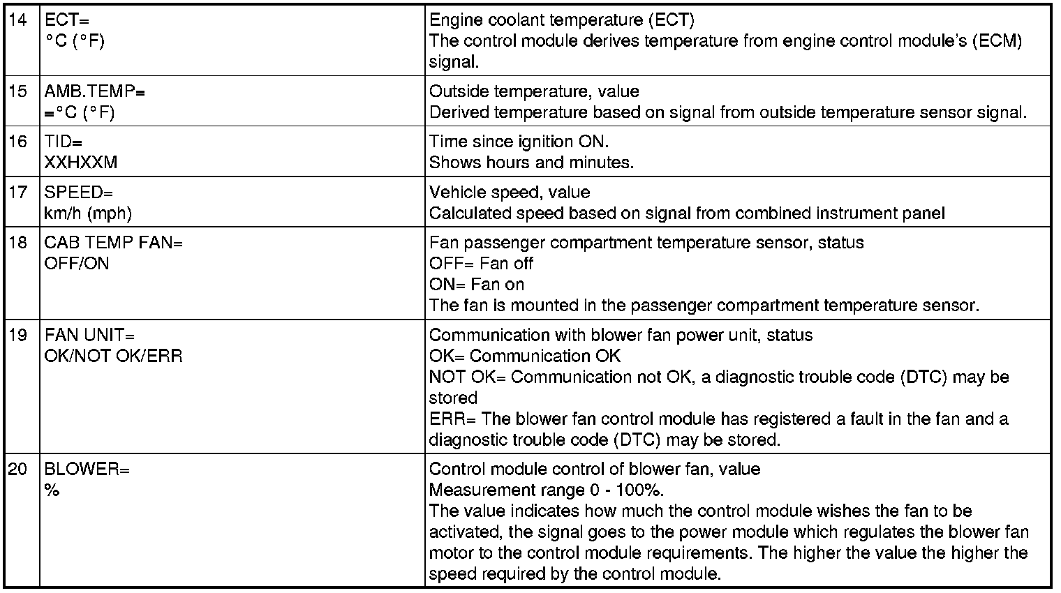 Note! Certain values can differ from values in Signal specification ECC Signal Specification ECC , which is because the values as follows are often calculated and filtered by the control module. In addition in certain cases the control module displays substitute values when a diagnostic trouble code (DTC).