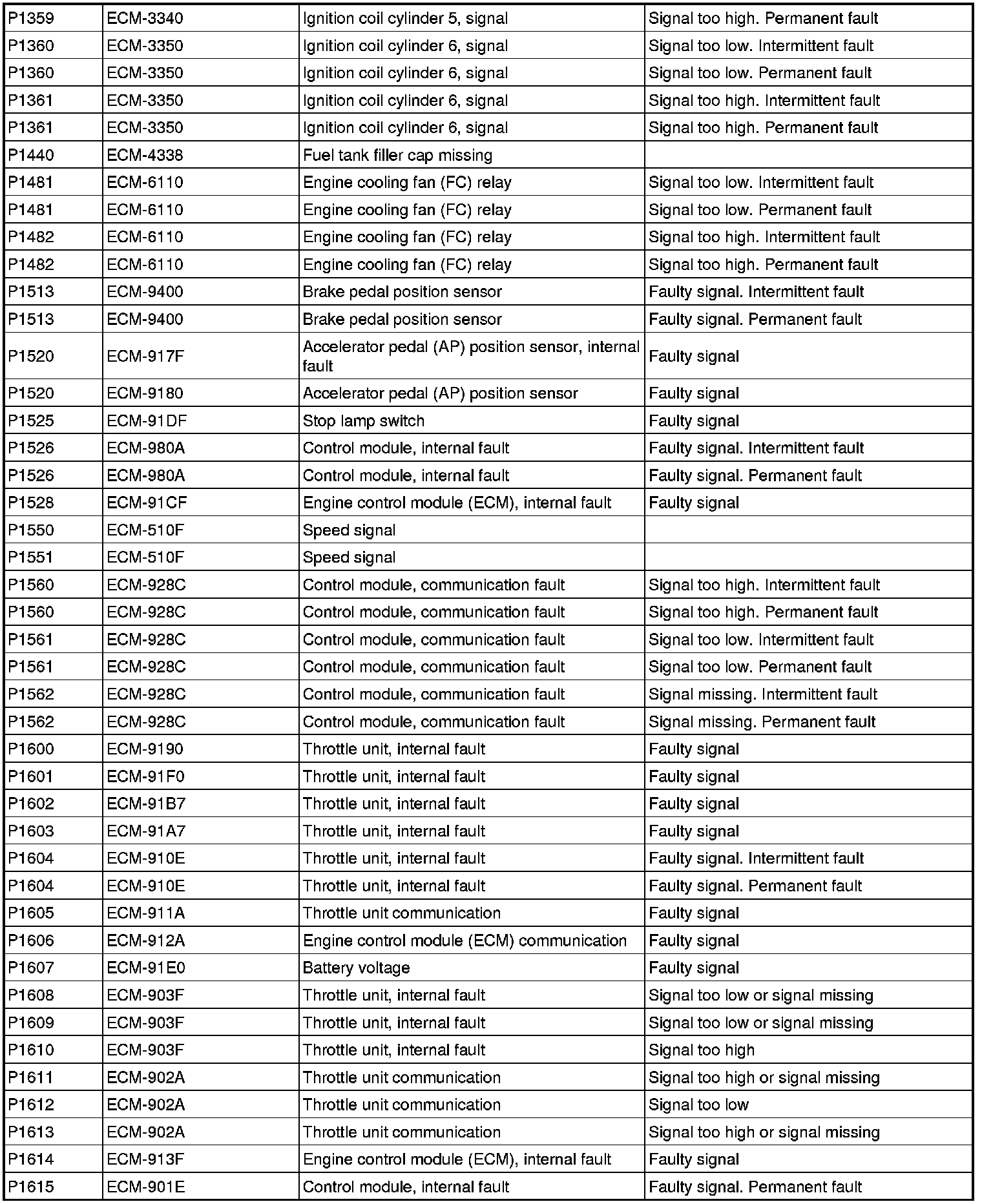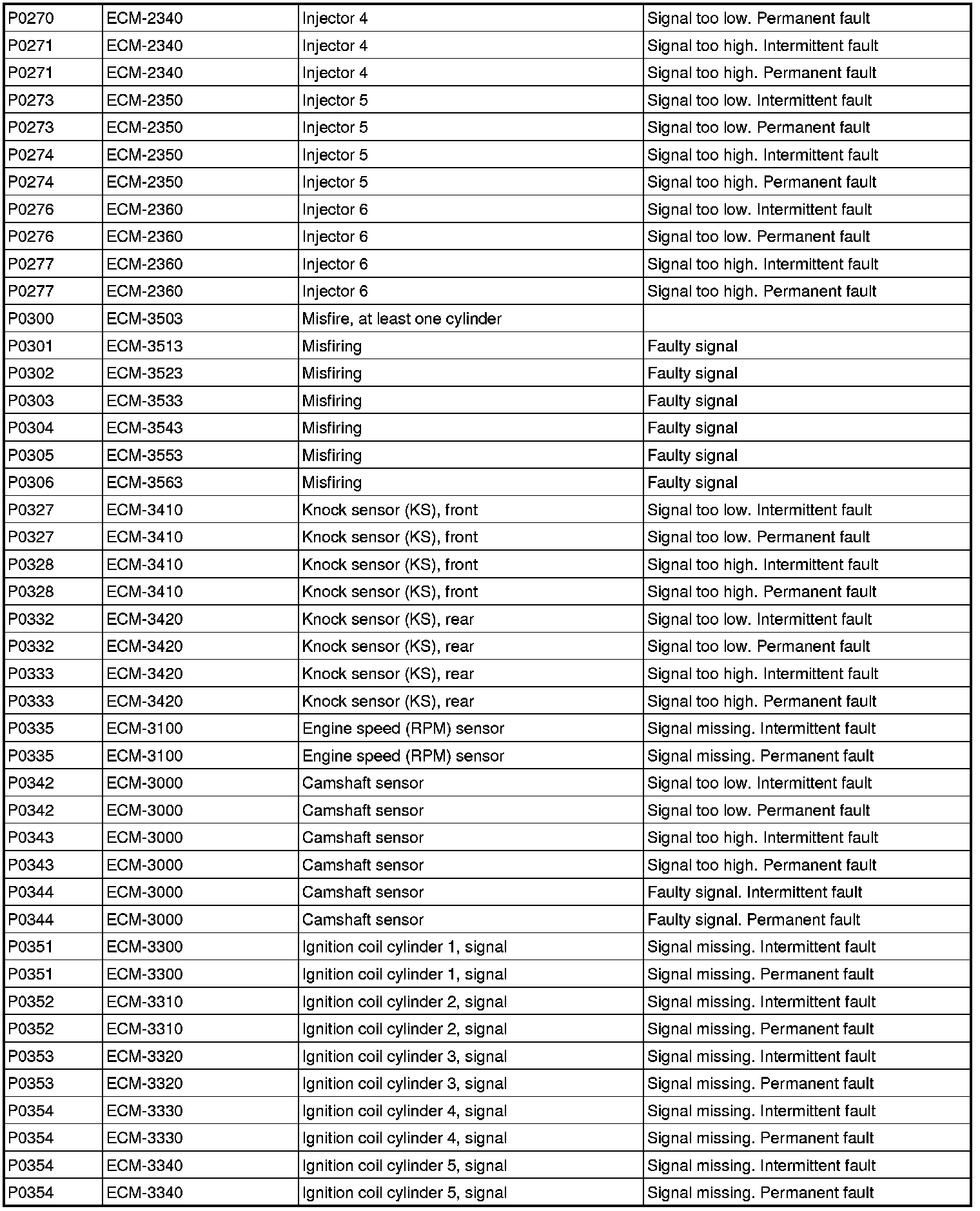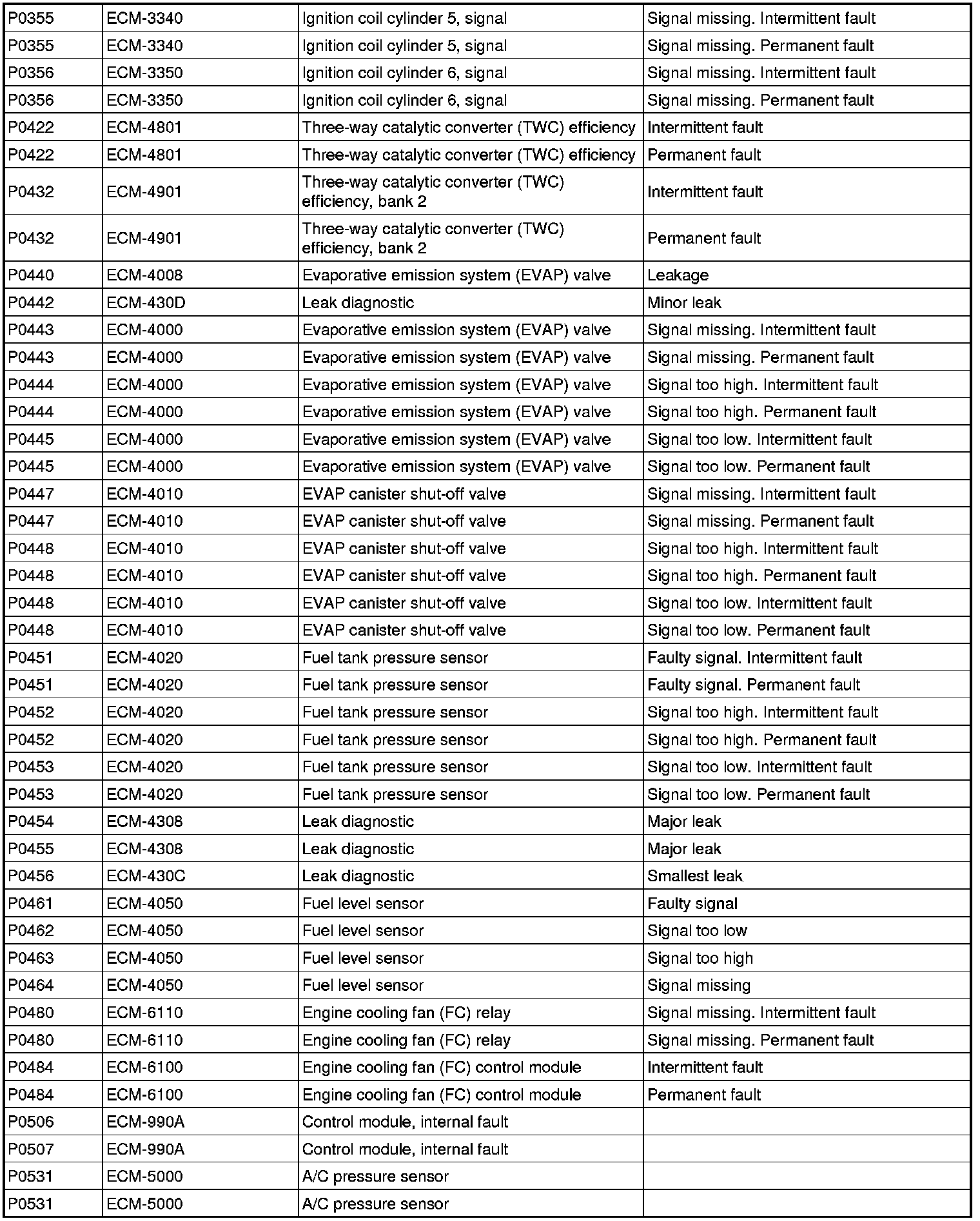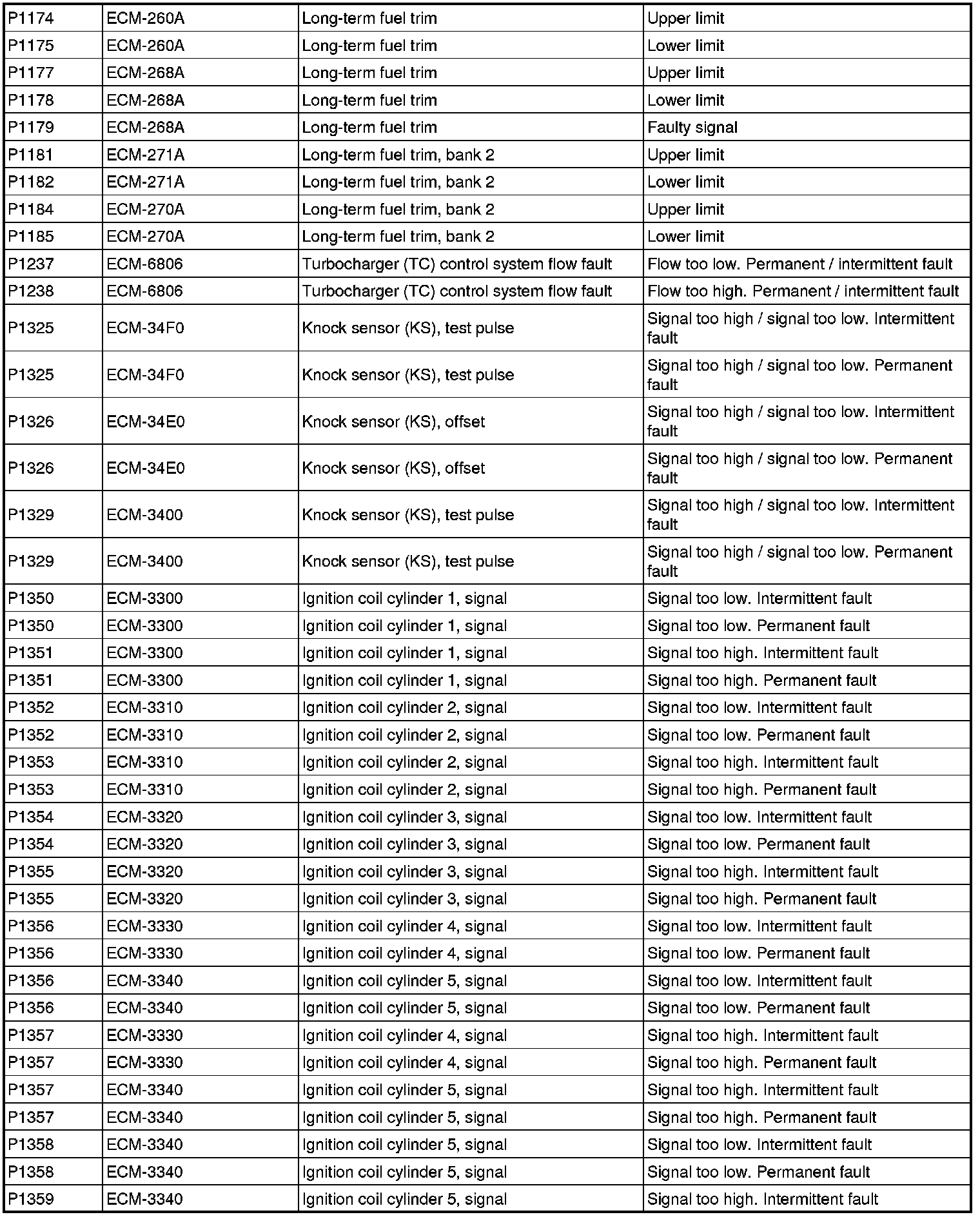 DTC Table (P Codes / ECM Codes)