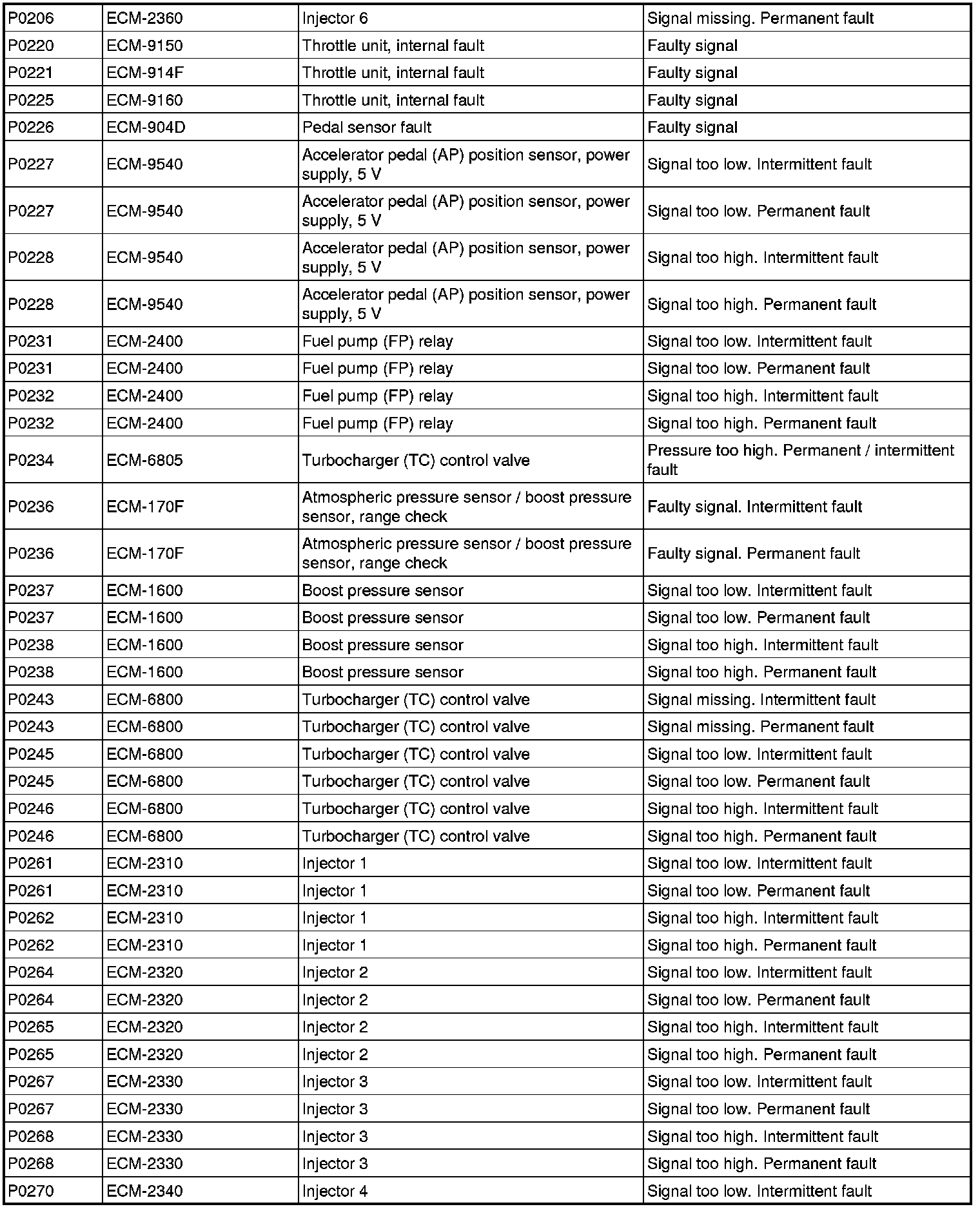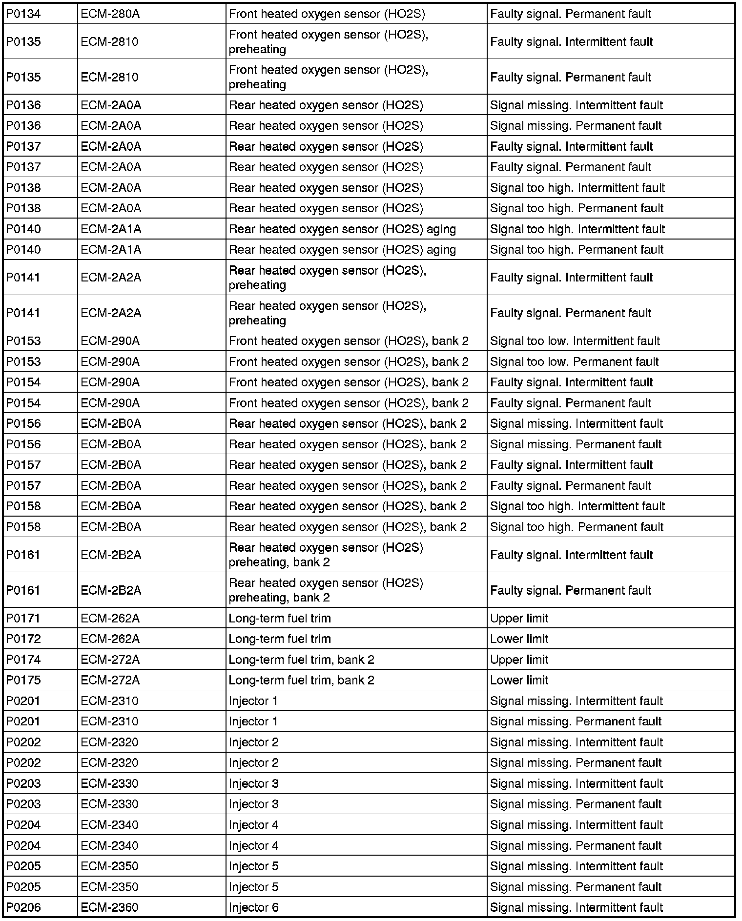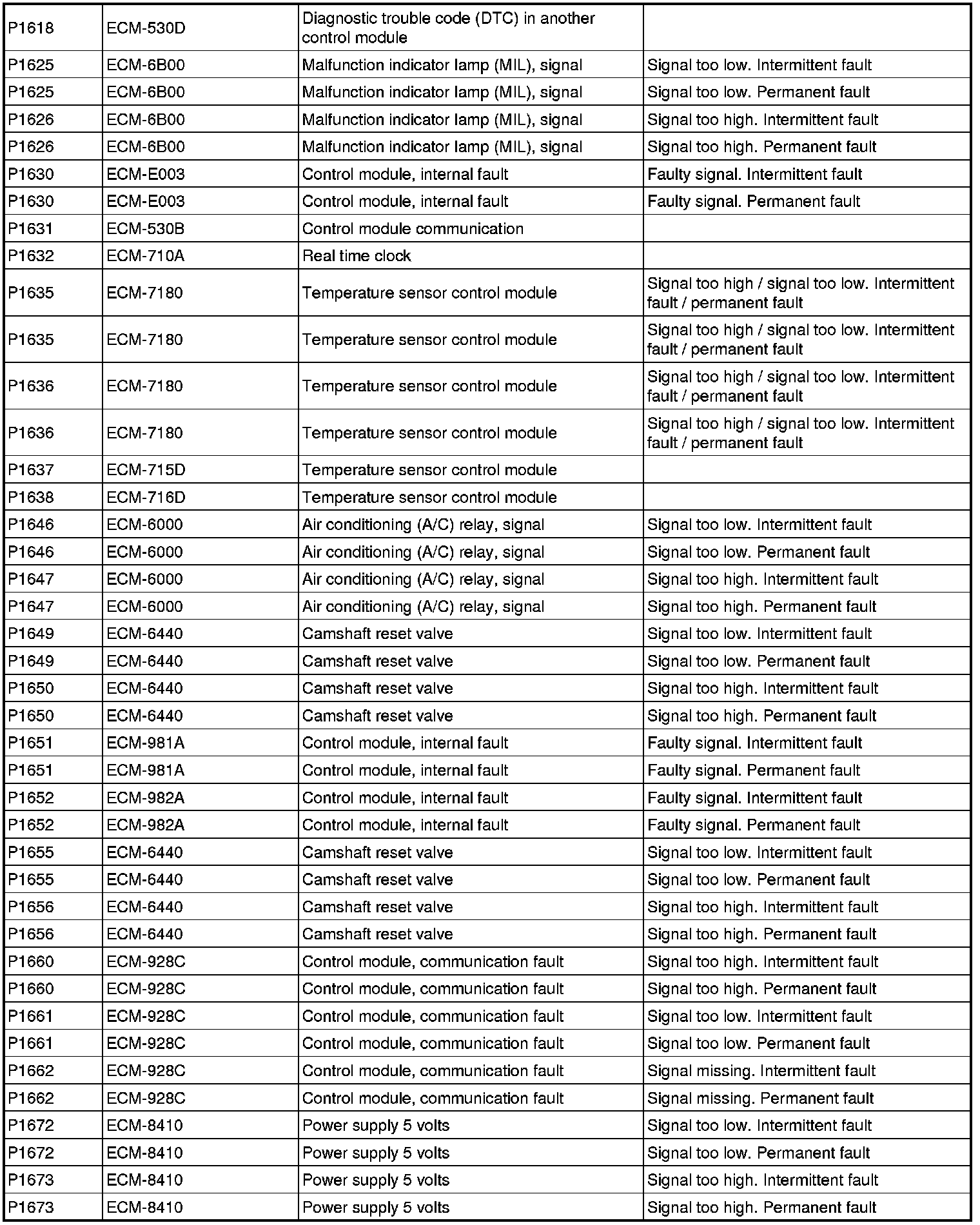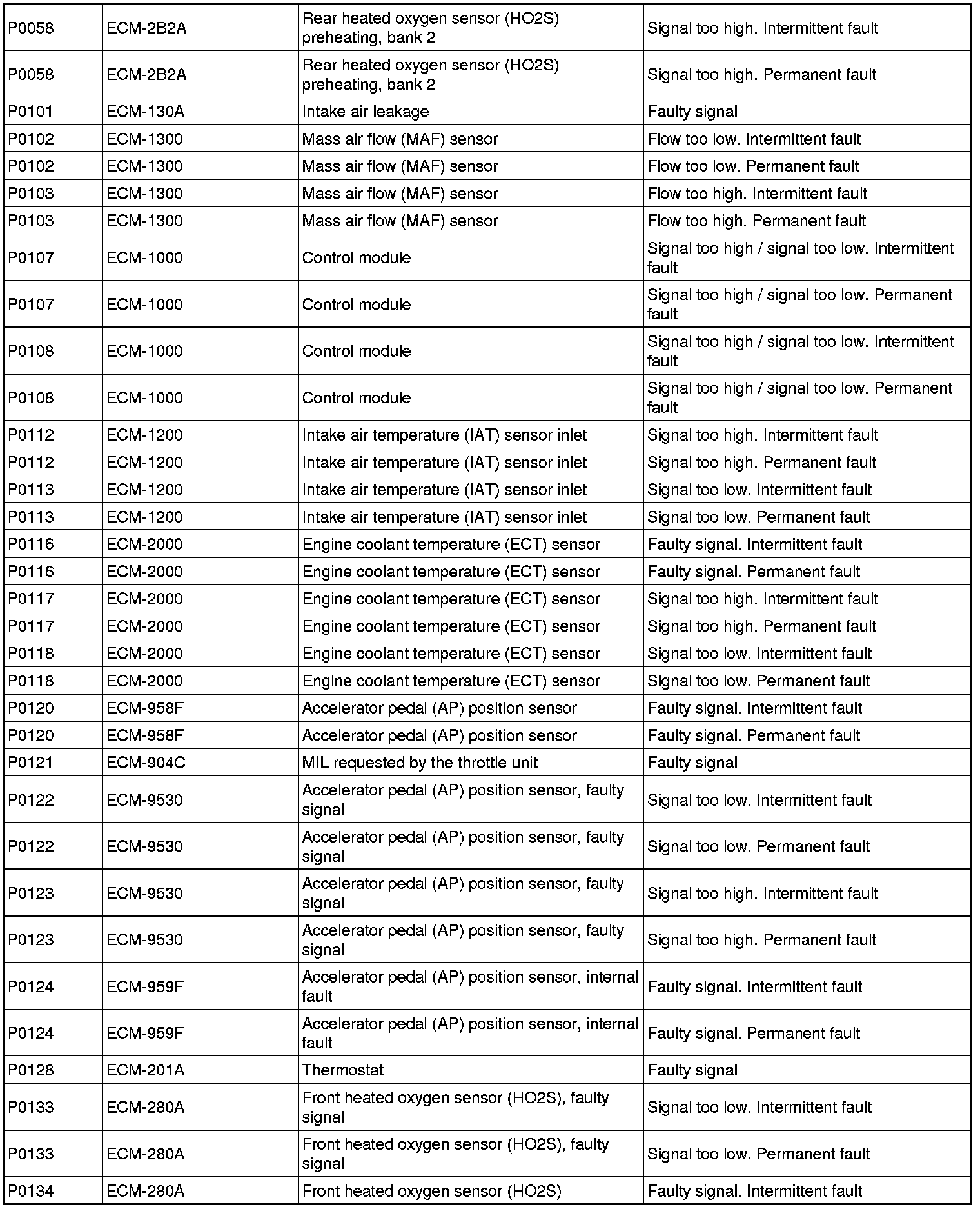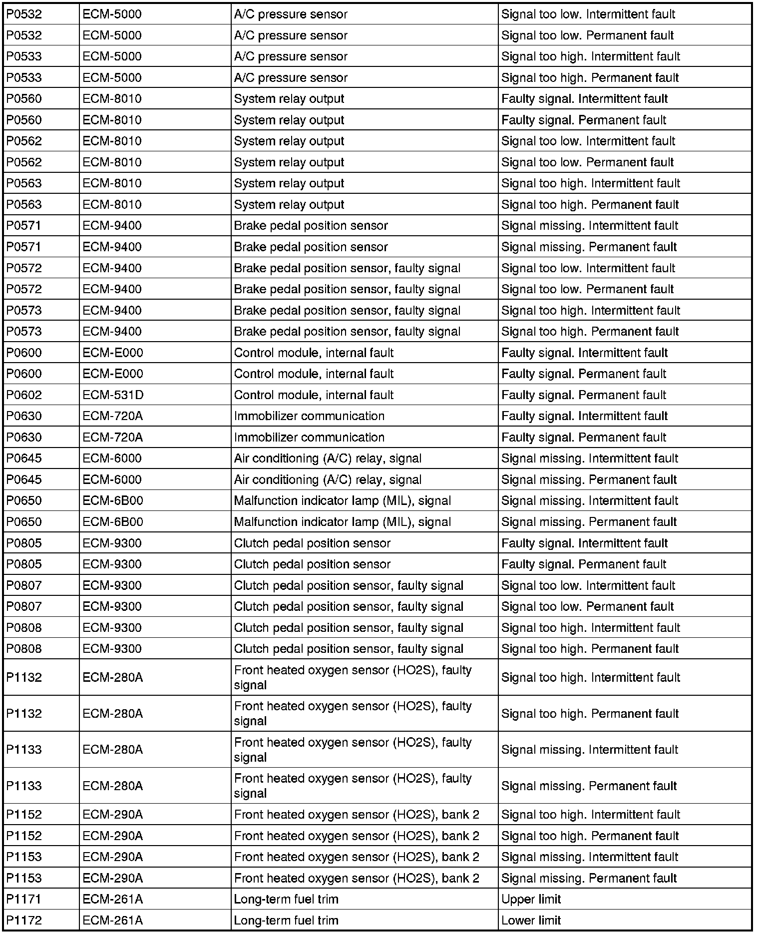DTC Table (P Codes / ECM Codes)