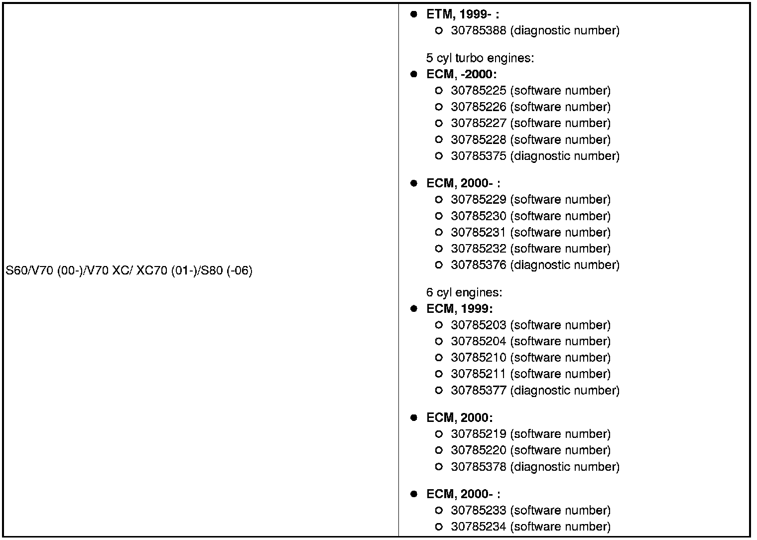 - Turbo engines and 6-cylinder non-turbo engines , (all markets except the USA/Canada market): Engine control module (ECM) software number 30785372 - 30785378 and electronic throttle module (ETM) diagnostic number 30785388.