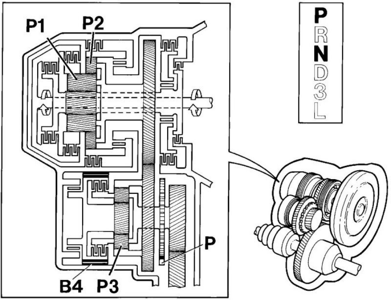 Brake B4 is activated in both P and N in order to minimize engagement impact. Otherwise this occurs when several brakes and clutches are activated simultaneously, when the gear selector is moved to position D or R. Because B4 is also applied in both 1st gear and reverse, the number of simultaneous engagements is reduced.