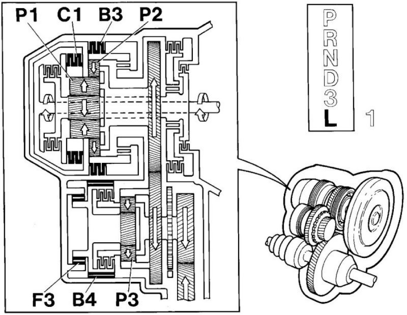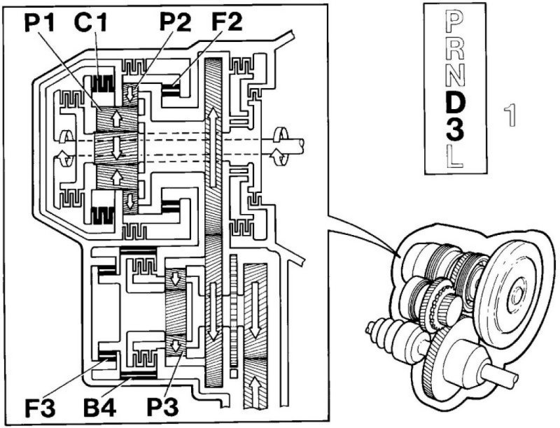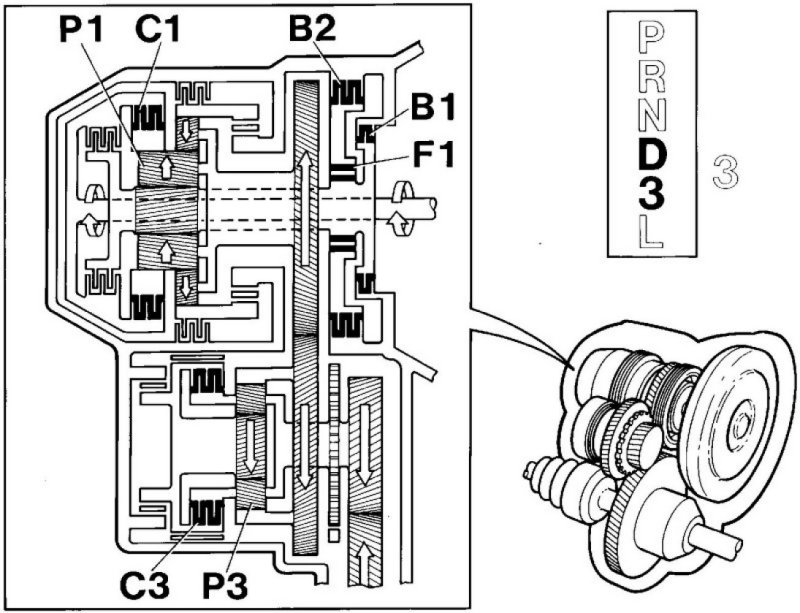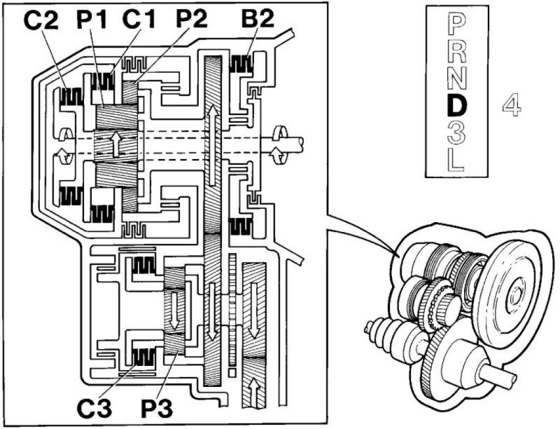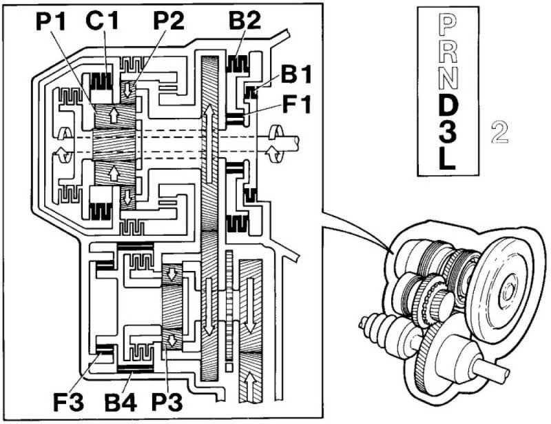 The driving intermediate gear and the planetary gear carrier rotate clockwise as a unit. B3 locks the front planetary train (P2) ring gear so that it cannot rotate in any direction, providing an engine brake. (In D and 3, B3 is not applied, so that no engine braking can be obtained, because of F2.)