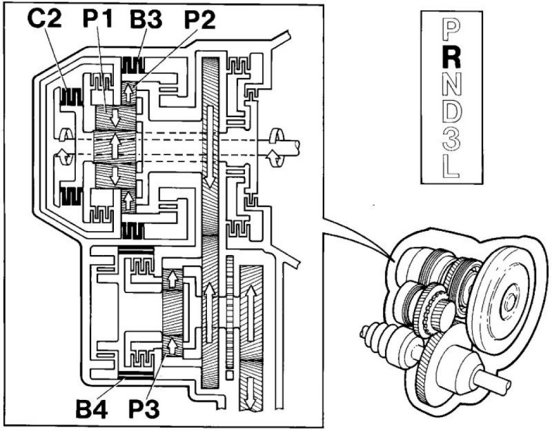 The power flow here is the same as in position D for 2nd gear. The input shaft rotates clockwise and C1 connects the input shaft together with the rear planetary train ring gear, so that it also rotates clockwise at the input shaft speed.