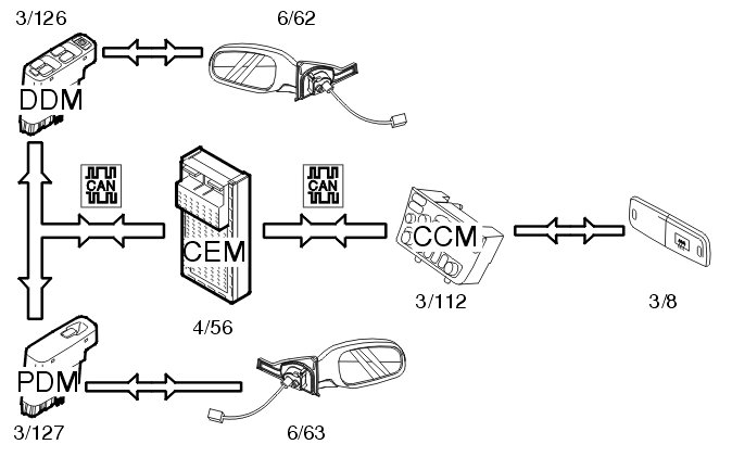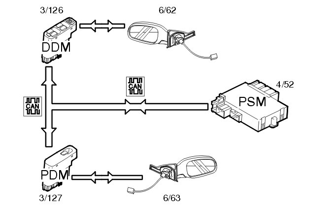 The position of the mirror is controlled using buttons on the driver door module (DDM) (3/126). The driver door module (DDM) transmits a signal directly to the mirror on the driver's side (6/62). When adjusting the mirror on the passenger side (6/63), a signal is transmitted from the driver door module (DDM) to the passenger door module (PDM) (3/127) on the Controller area network (CAN).