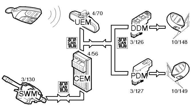 The guide lighting is activated using the left-hand control stalk (the key must be removed from the ignition switch). The steering wheel module (SWM) (3/130) then transmits a signal via the controller area network (CAN) to the central electronic module (CEM) (4/56). When the car is then locked, the central electronic module (CEM) sends a signal onwards via the controller area network to the driver door module (DDM) (3/126) and passenger door module (PDM) (3/127), which turn on the lights in the door mirrors (10/148 and 10/149). The lights are part of the guide lighting function and remain on for a set time (30, 60 or 90 seconds).