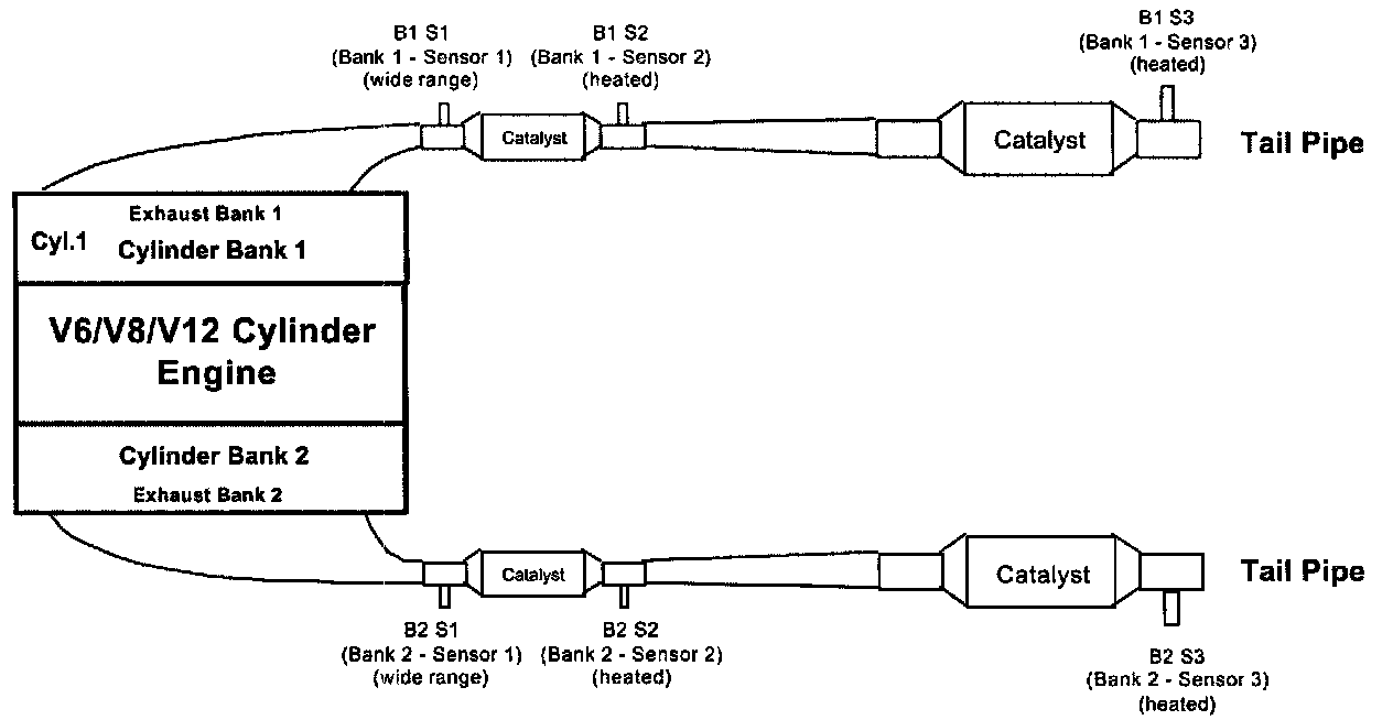 Oxygen Sensor and Catalyst Configuration ExampleV6/V8/V12 Engine W/2 Exhaust Banks & 4 Catalysts: