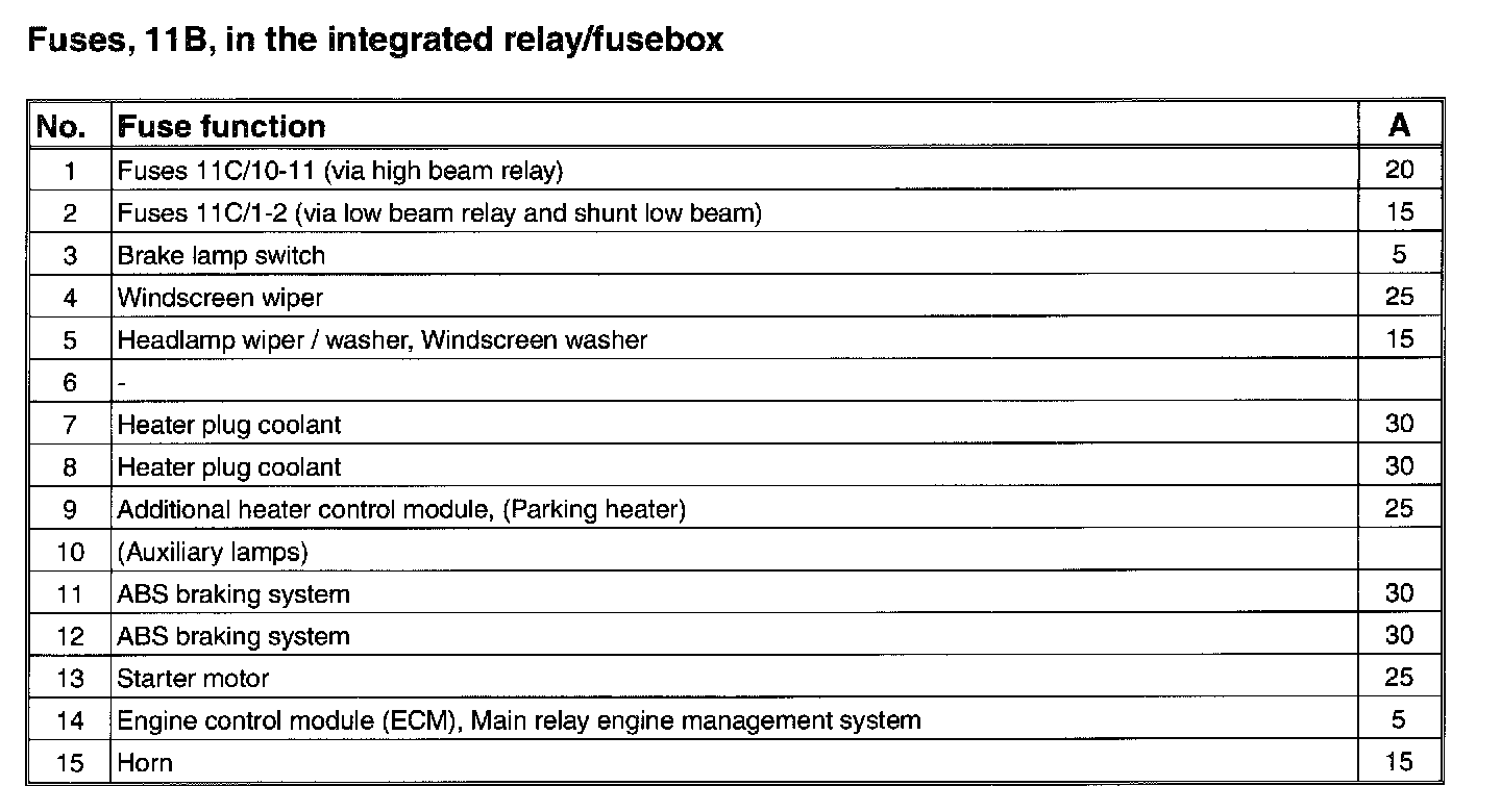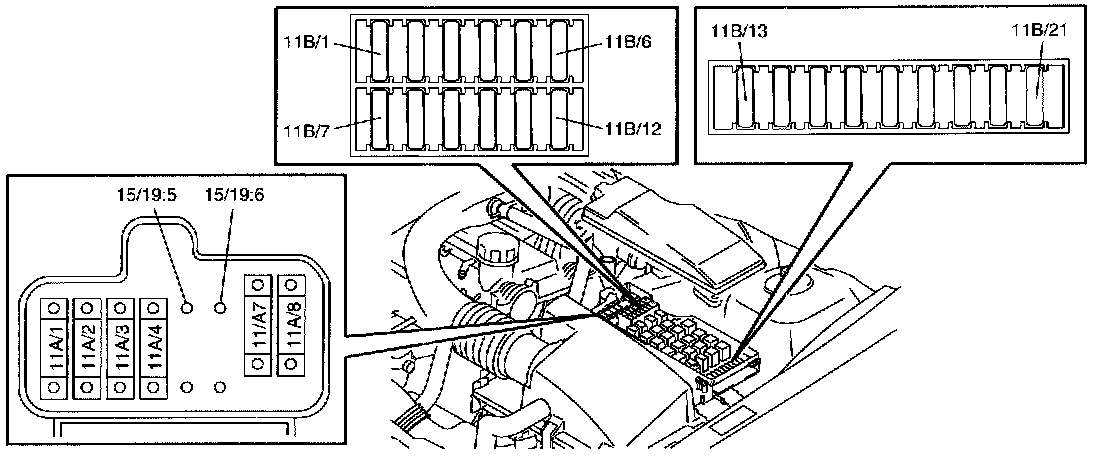 Fuses, 11B/1-15, in the integrated relay/fusebox:
