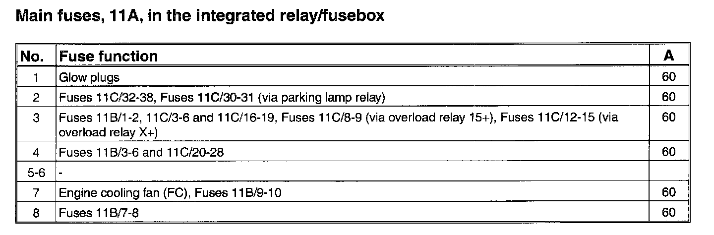 Main fuses, 11A/1-8, in the integrated relay/fusebox: