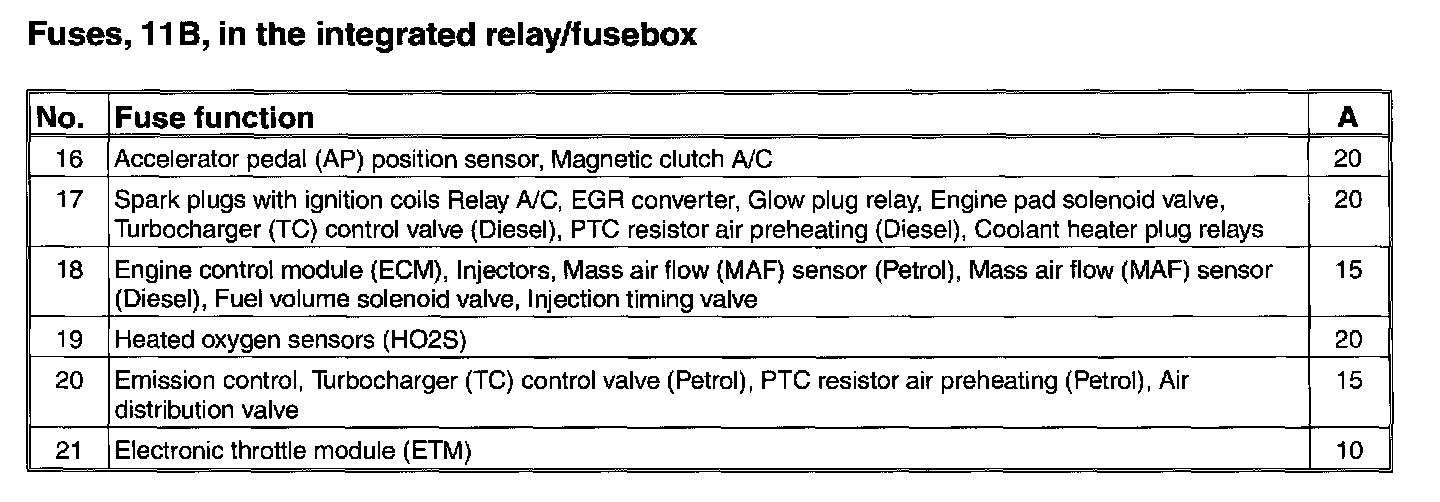 Fuses, 11B/16-21, in the integrated relay/fusebox: