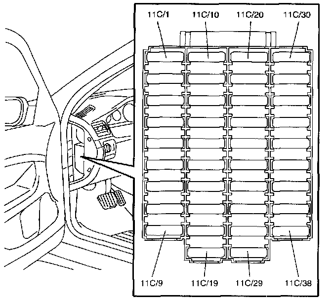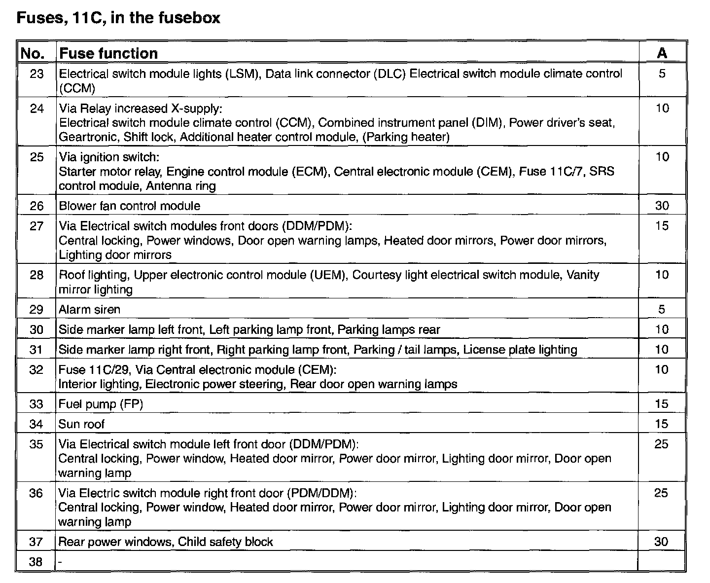 Fuses, 11C/23-38, in the fusebox: