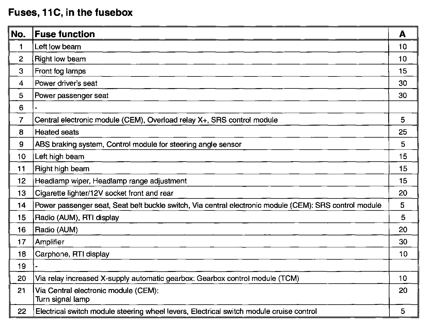 Fuses, 11C/1-22, in the fusebox: