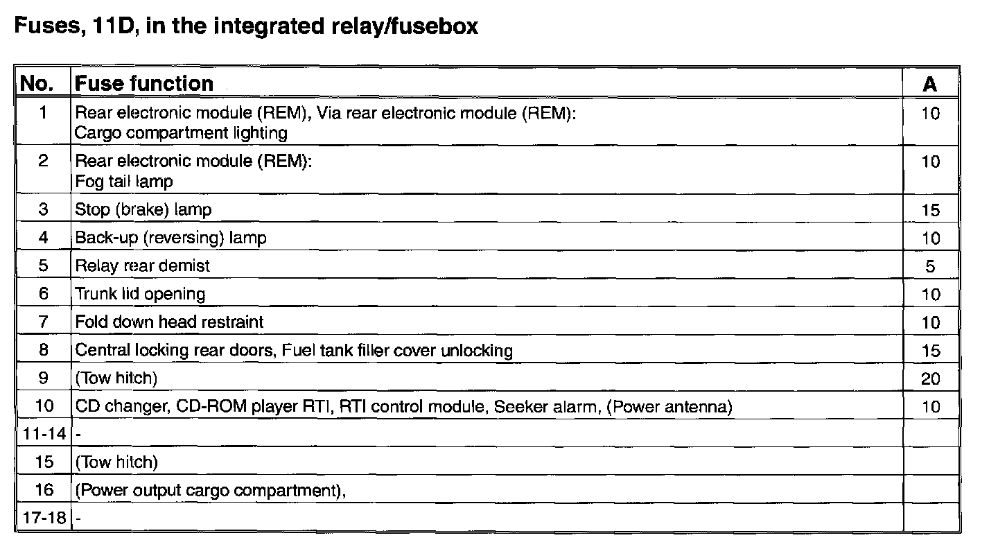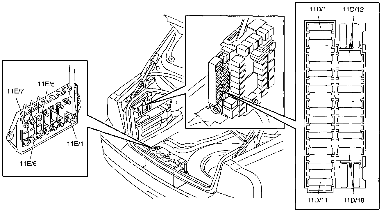 Fuses, 11D/1-18, in the integrated relay/fusebox: