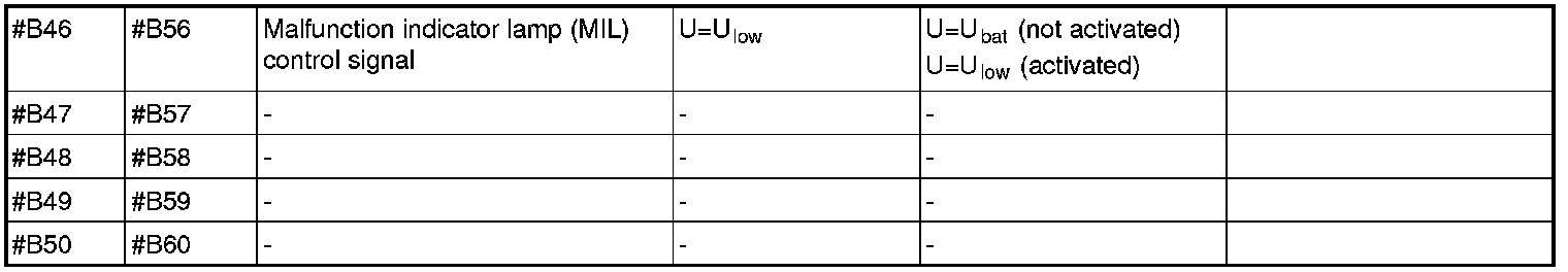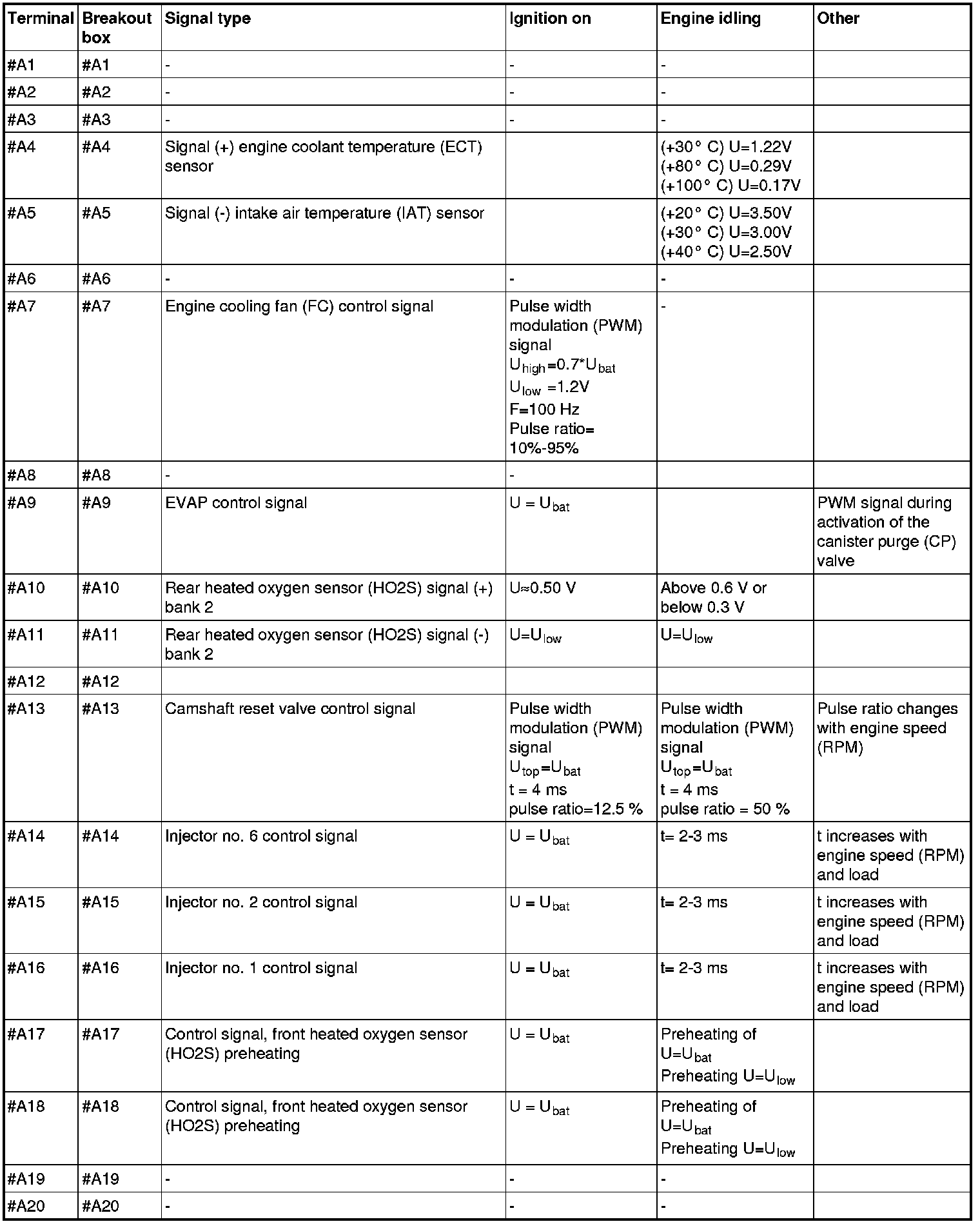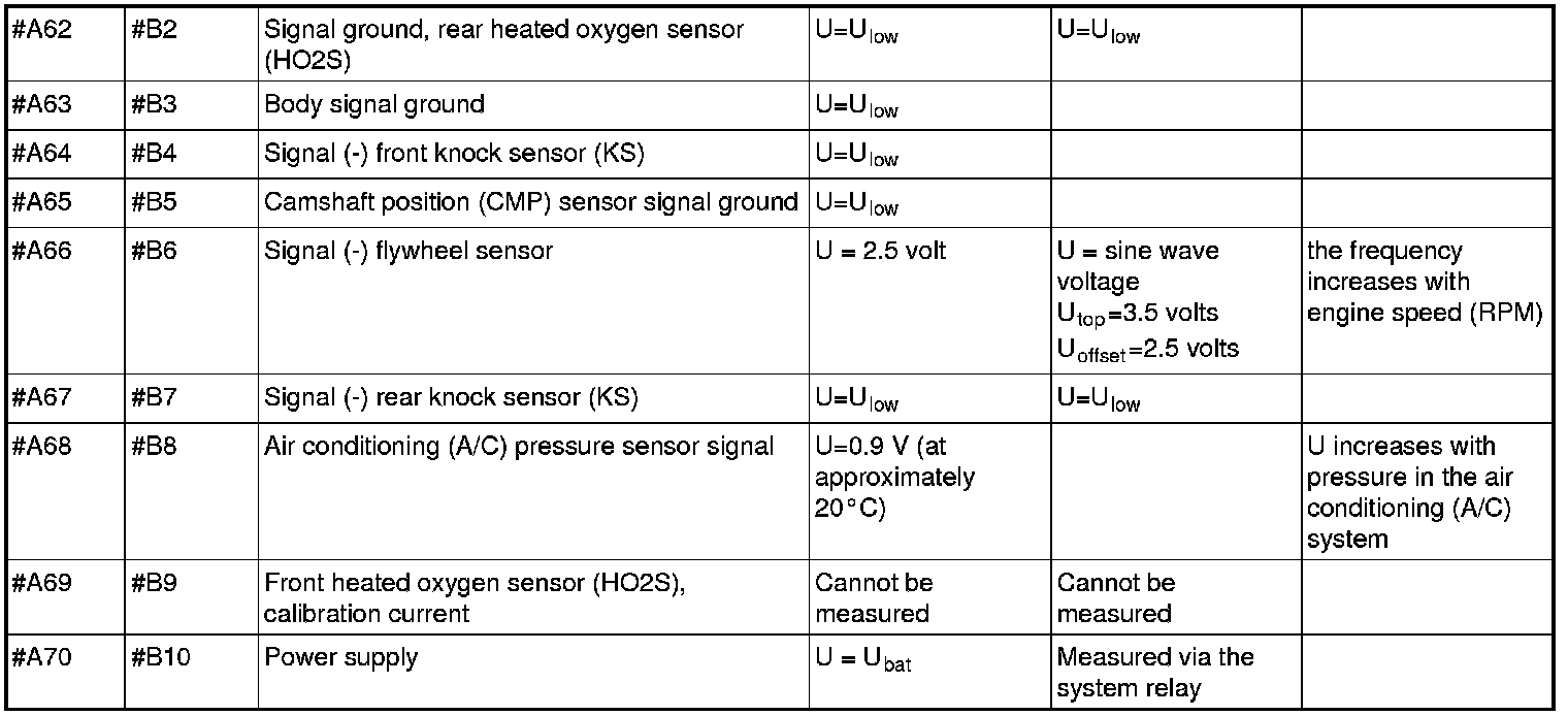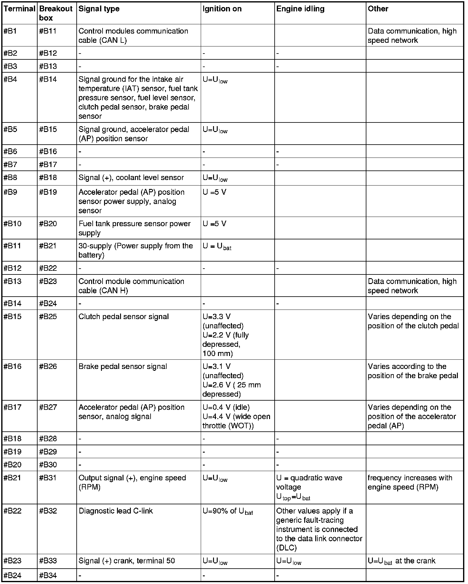 All the values given below are between the respective terminal in column 1 and terminal #B3 in column 2 (power ground) unless otherwise stated in brackets after the table entry. Control module terminals #A1-#A60 correspond to terminals #A1-#60 on the breakout box, terminals #A61-#A70 correspond to terminals #B1-#B10 on the breakout box and terminals #B1-#B50 correspond to terminals #B10-#B60 on the breakout box.