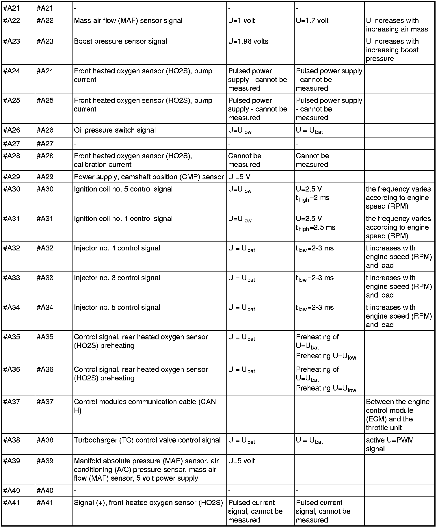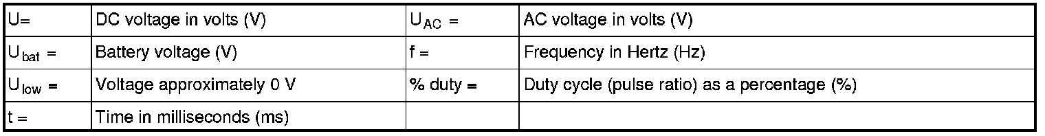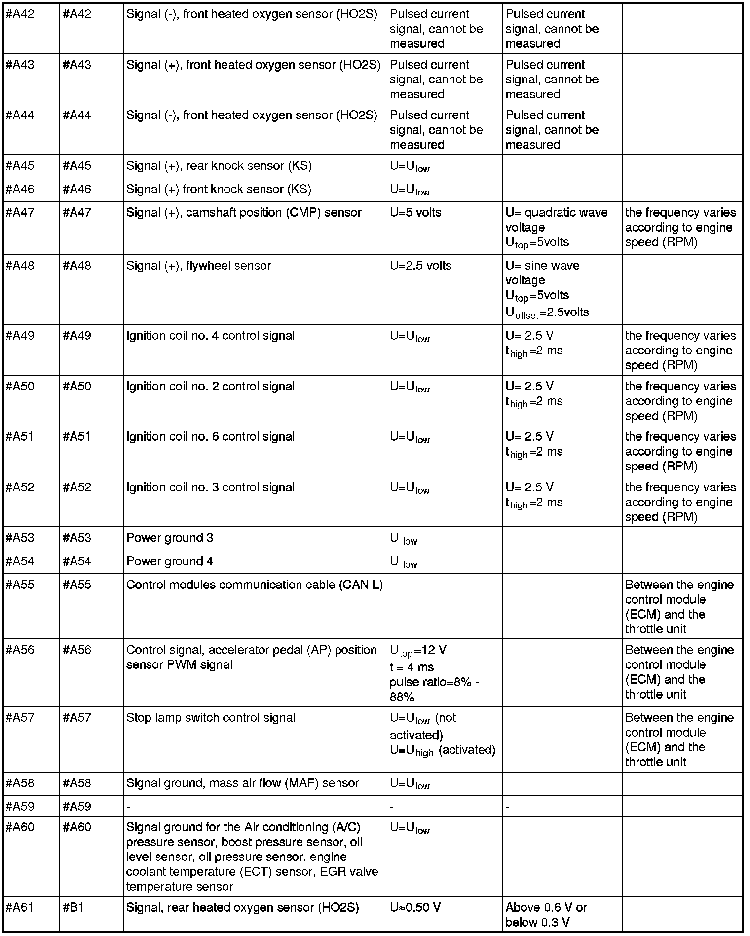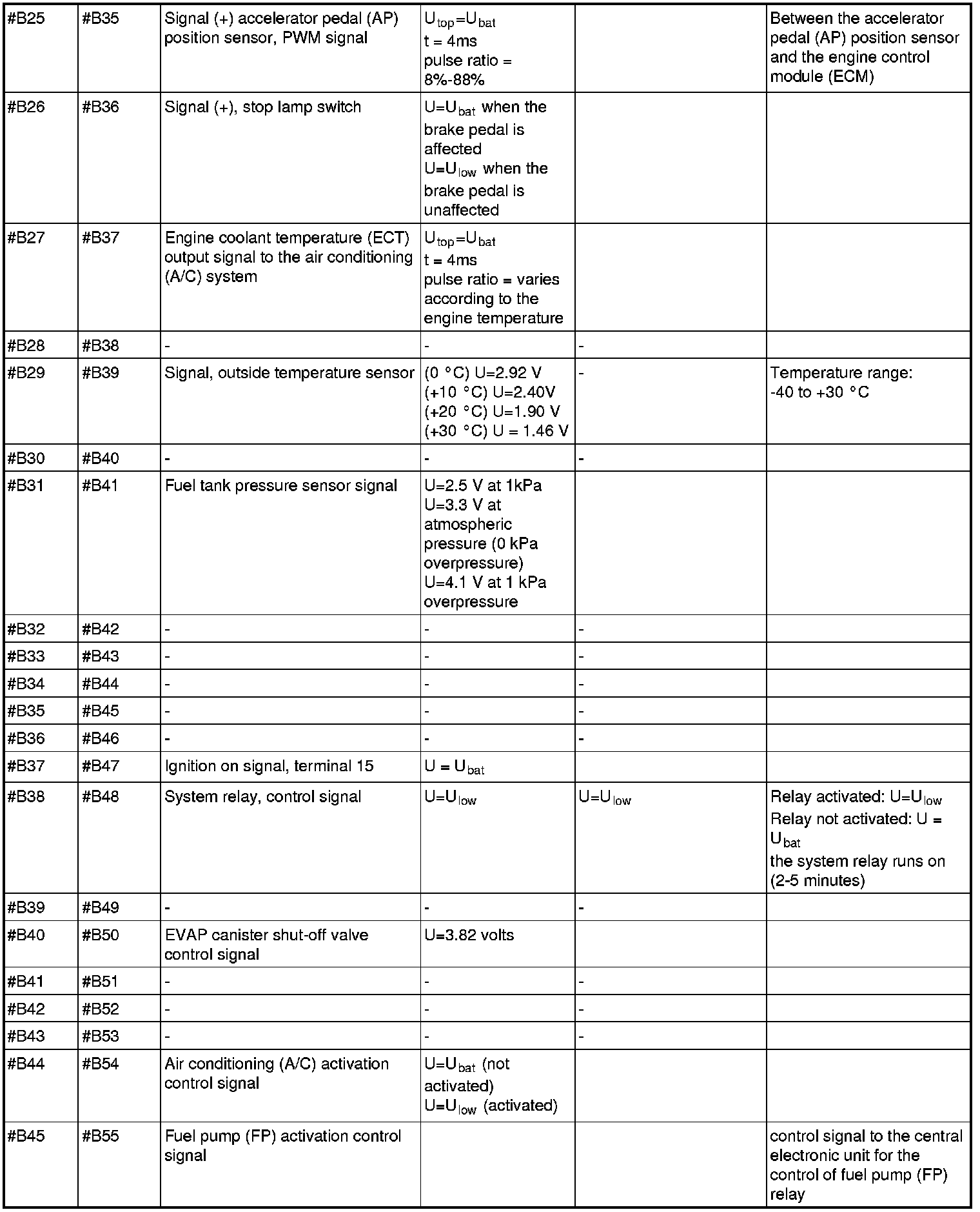All the values given below are between the respective terminal in column 1 and terminal #B3 in column 2 (power ground) unless otherwise stated in brackets after the table entry. Control module terminals #A1-#A60 correspond to terminals #A1-#60 on the breakout box, terminals #A61-#A70 correspond to terminals #B1-#B10 on the breakout box and terminals #B1-#B50 correspond to terminals #B10-#B60 on the breakout box.