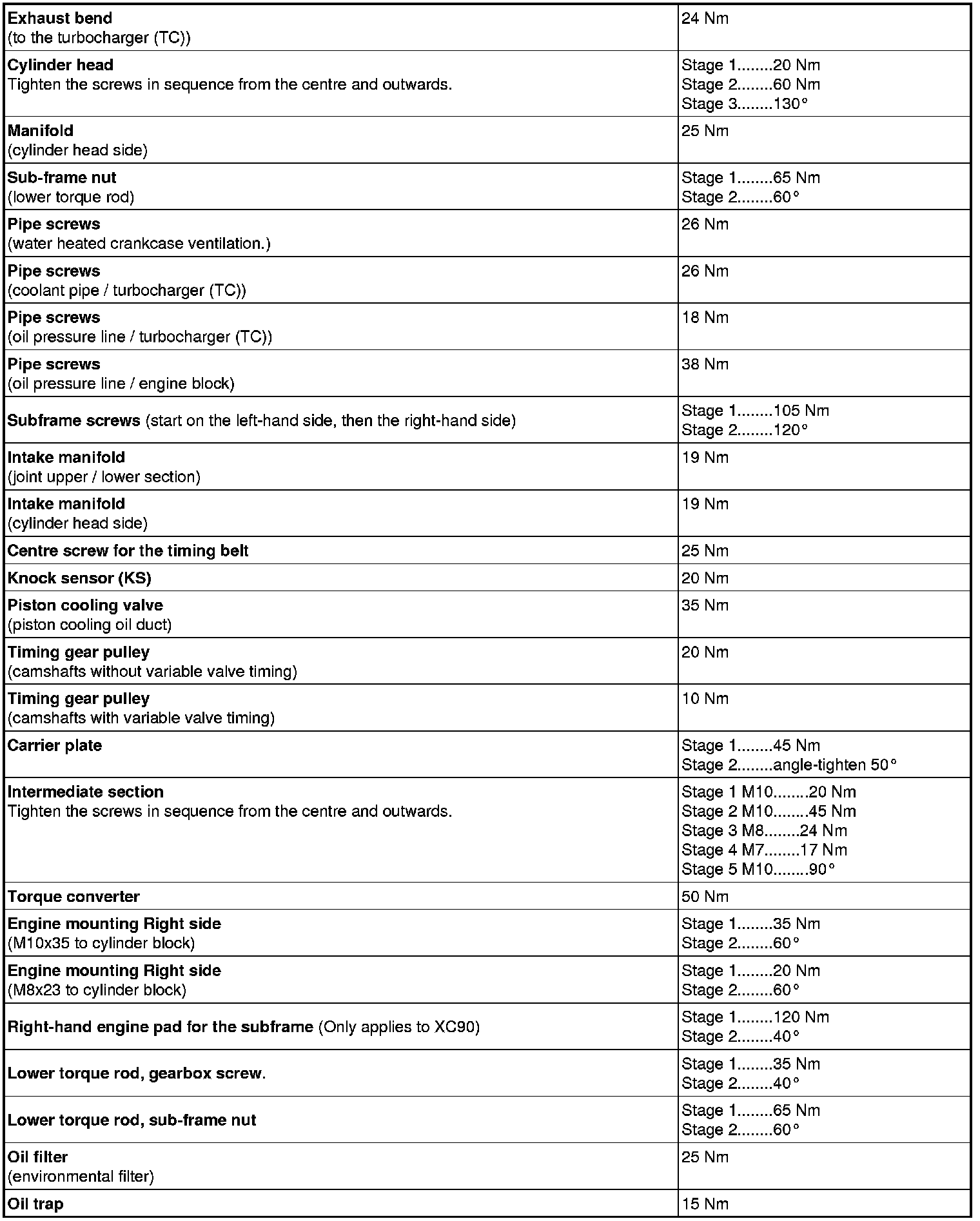 See the table below to find the tightening torques for components not included in the summary.