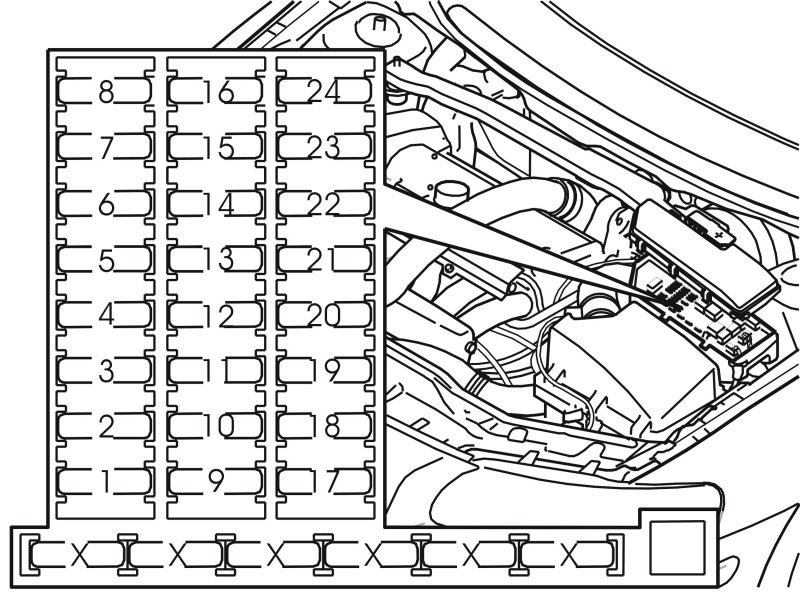 - For integrated relay / fuseboxes with 24 fuses, see Integrated relay / fusebox in engine compartment Integrated Relay/Fusebox, Engine Compartment, Replacing