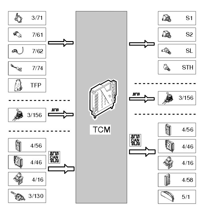 The table below summarizes the input signals to and output signals from the transmission control module (TCM). The signal types are divided into directly connected signals, serial communication and Controller area network (CAN) communication. The following illustration displays the same information with the Volvo component designations.