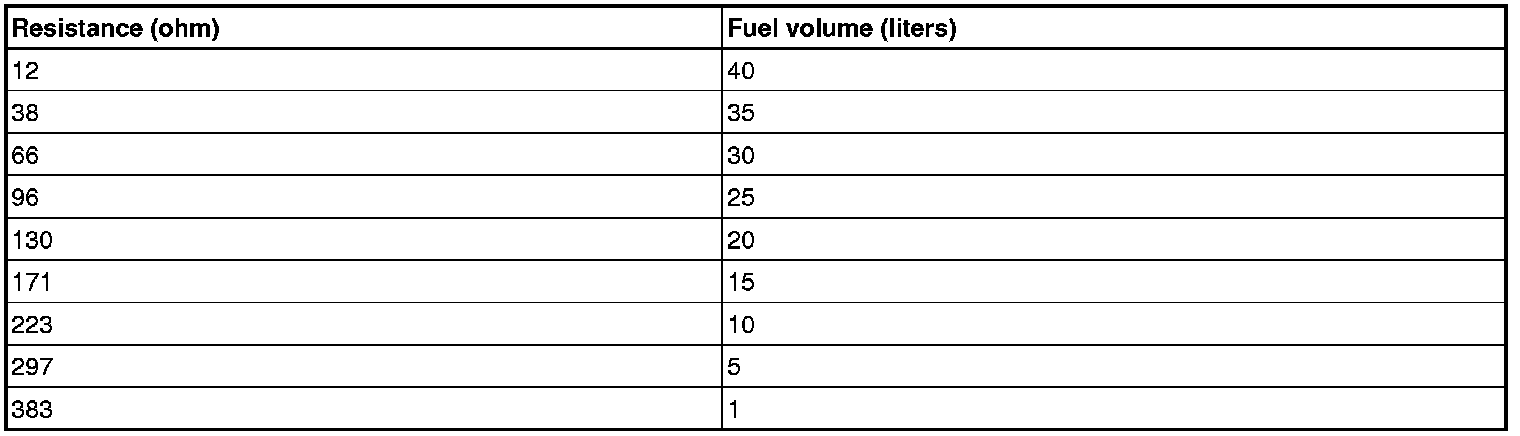 The following table lists the fuel level sensor resistance and the corresponding fuel volume.