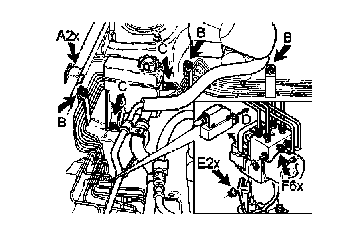 - the first three mounting clamps (B) for the brake pipes on the fender liner and cowl panel