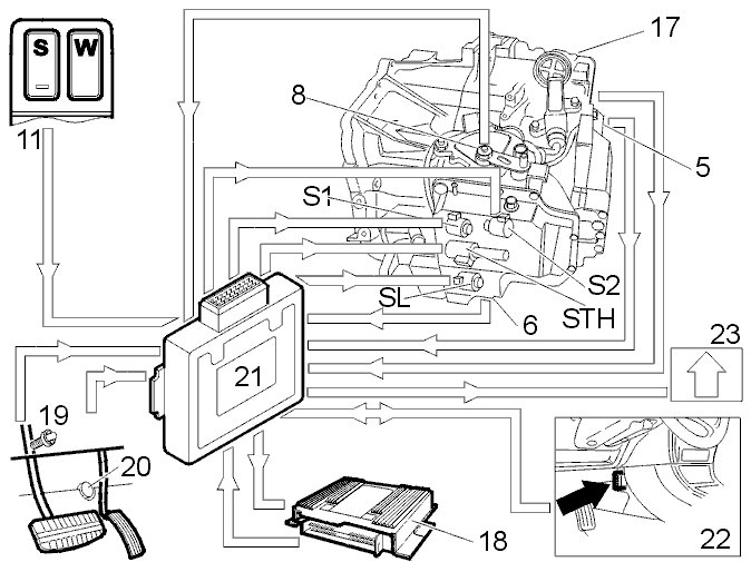 All of this information is processed by the transmission control module (TCM) (21). The control module calculates which gear will provide the best driving performance for the driving mode selected. The transmission control module (TCM) orders gear shifting by transmitting gear shifting signals to two shift solenoids (S1, S2) in the transmission. Depending on the input signals, the control module determines if and when torque converter lock- up should be activated. Lock- up is engaged with the help of a special solenoid (SL).